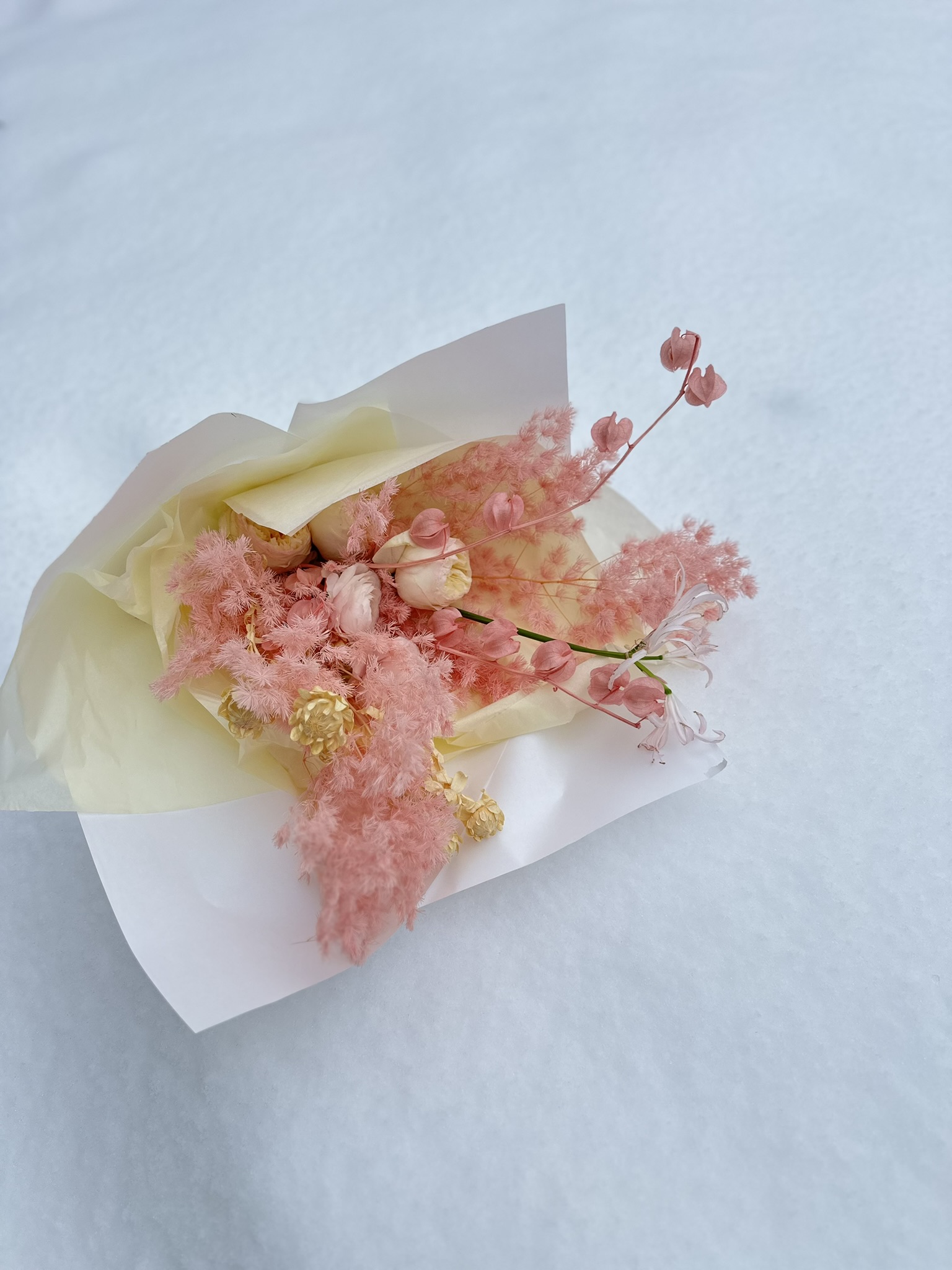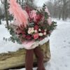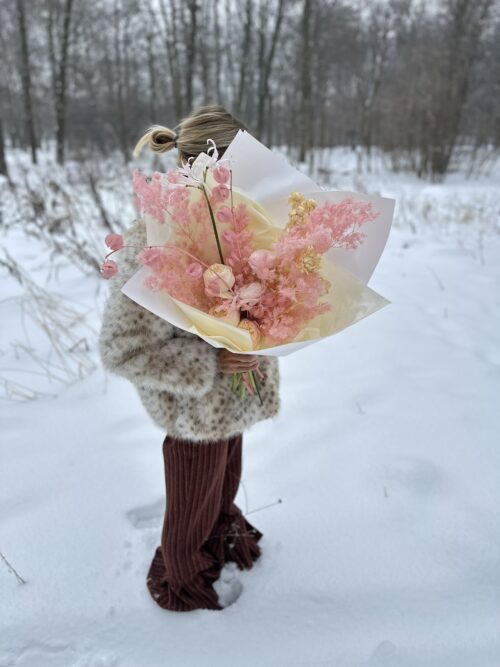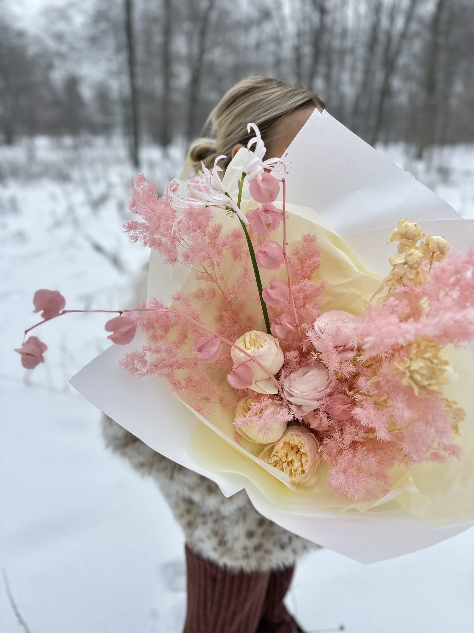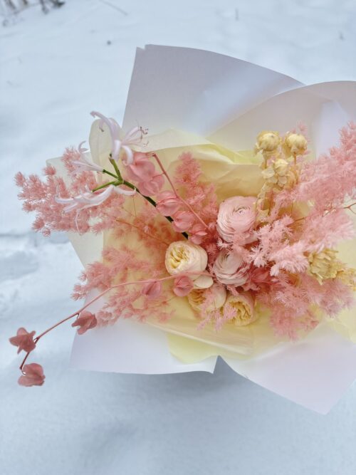 Połączenie pudrowych róż, delikatnych odcieni różu jaskrów i kremowych elementów preparowanych, które zostają piękne na długo, sprawia, że to idealny wybór na wiele okazji.