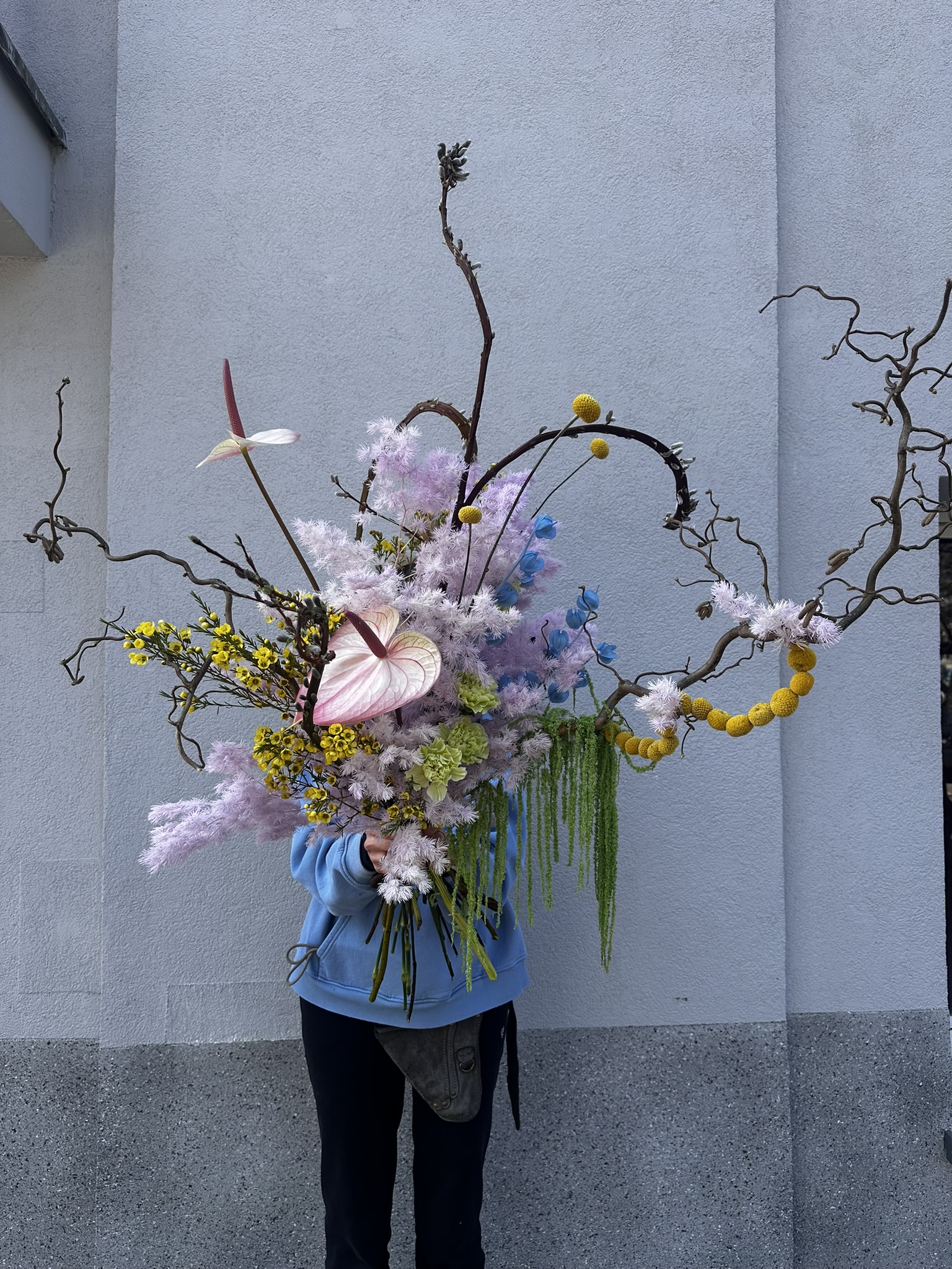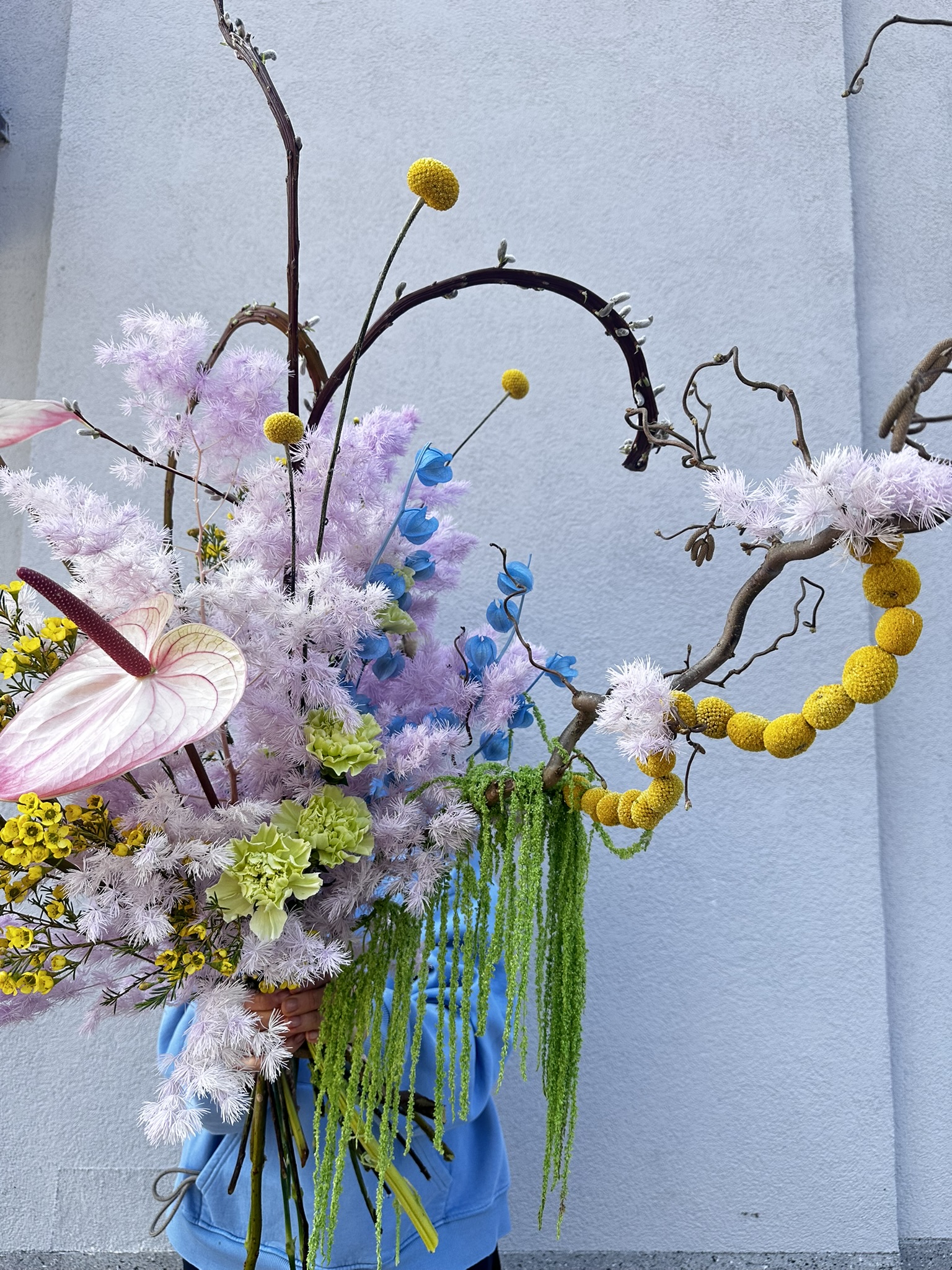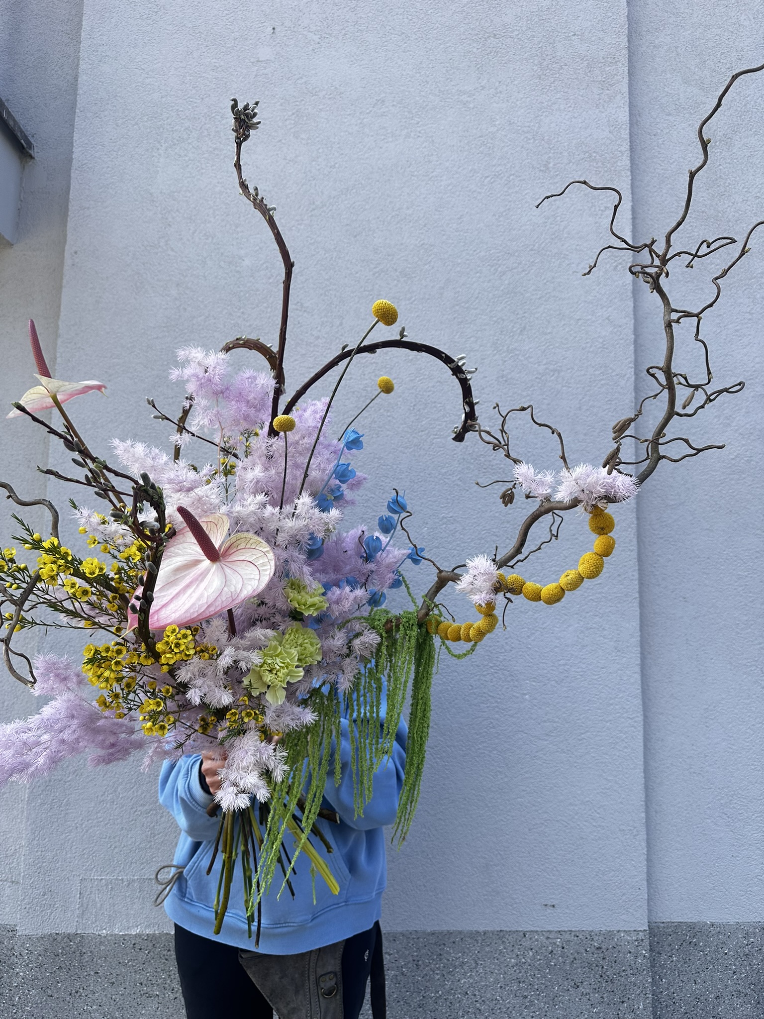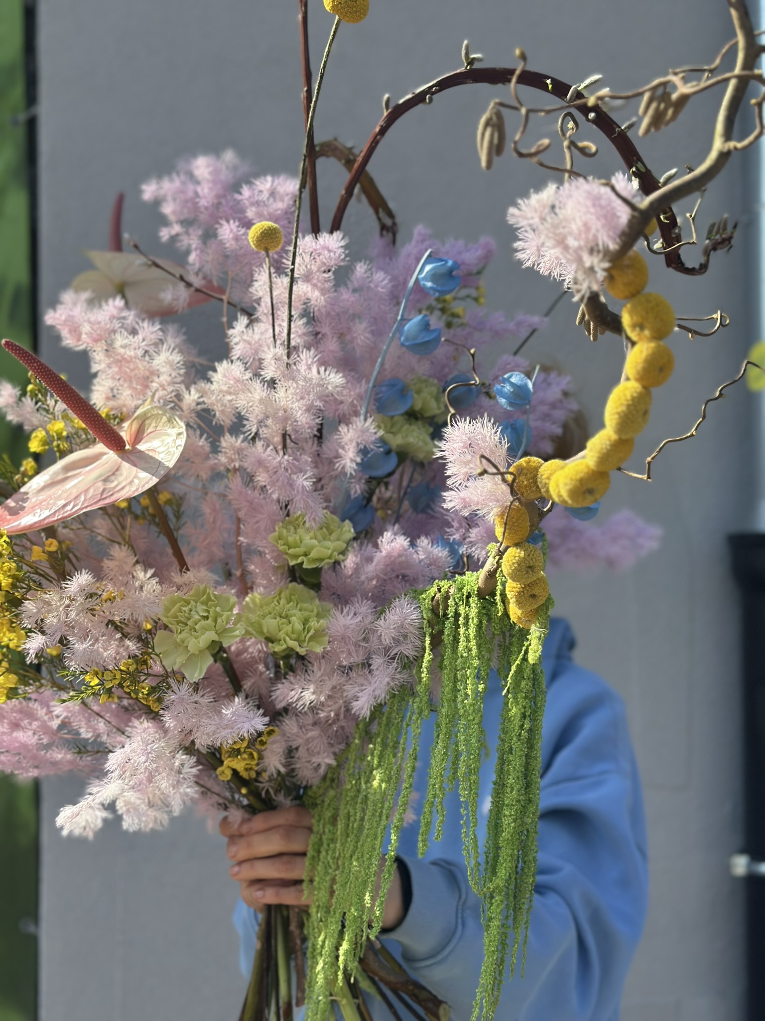 Duży bukiet Pastelowa Dżungla zrobi wielkie wrażenie – lekko dziki, kolorowy i absolutnie wyjątkowy. Łączy pastelowe kwiaty z naturalnymi, poskręcanymi gałęziami i nowoczesnymi akcentami, dzięki czemu wygląda jak mała instalacja artystyczna, a nie zwykły bukiet.