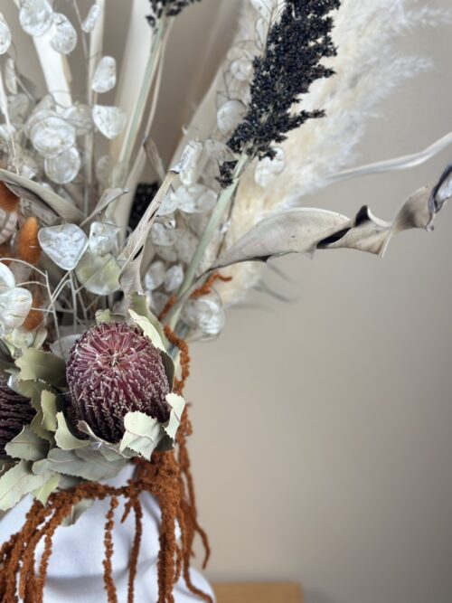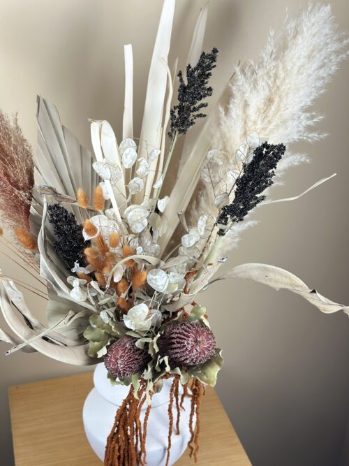 Bukiet w naturalnych barwach, z trawą pampasową, banksją, liśćmi palmy i preparowanym szarłatem.