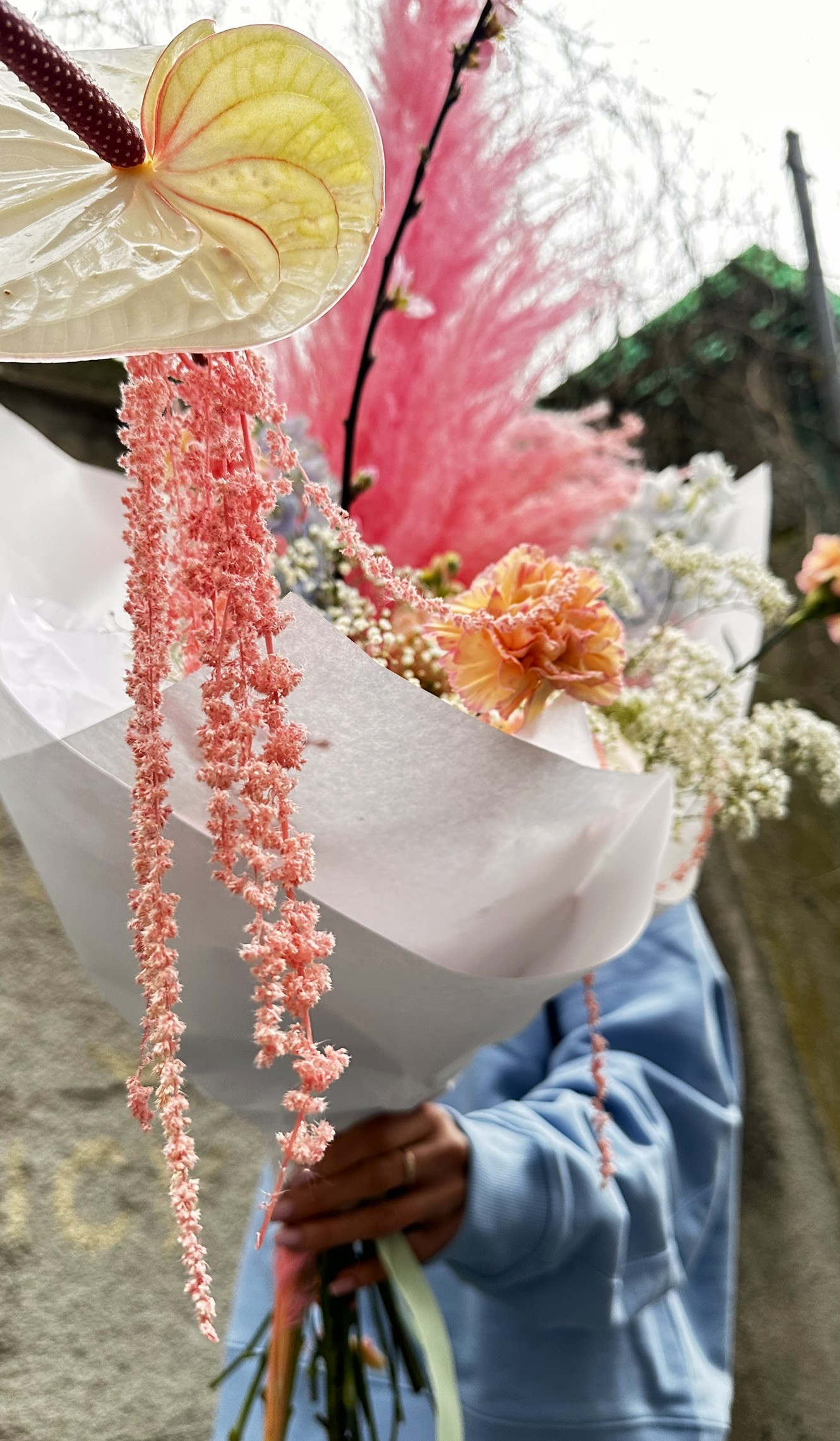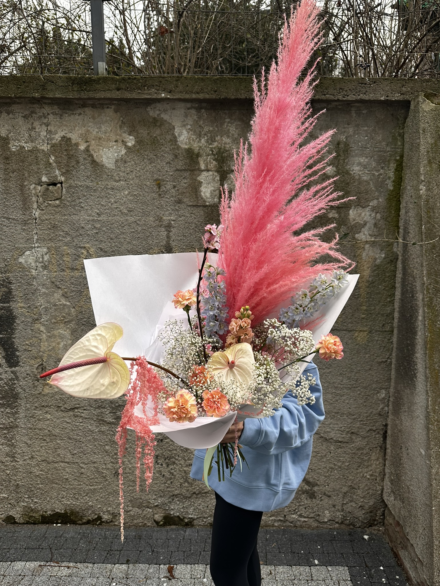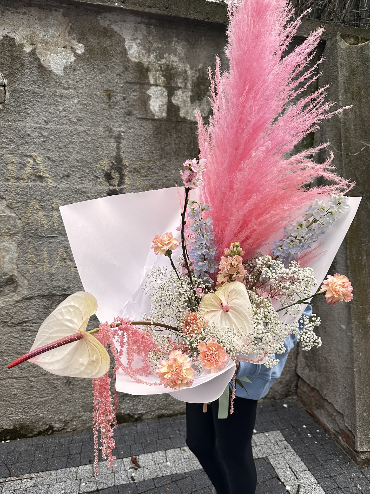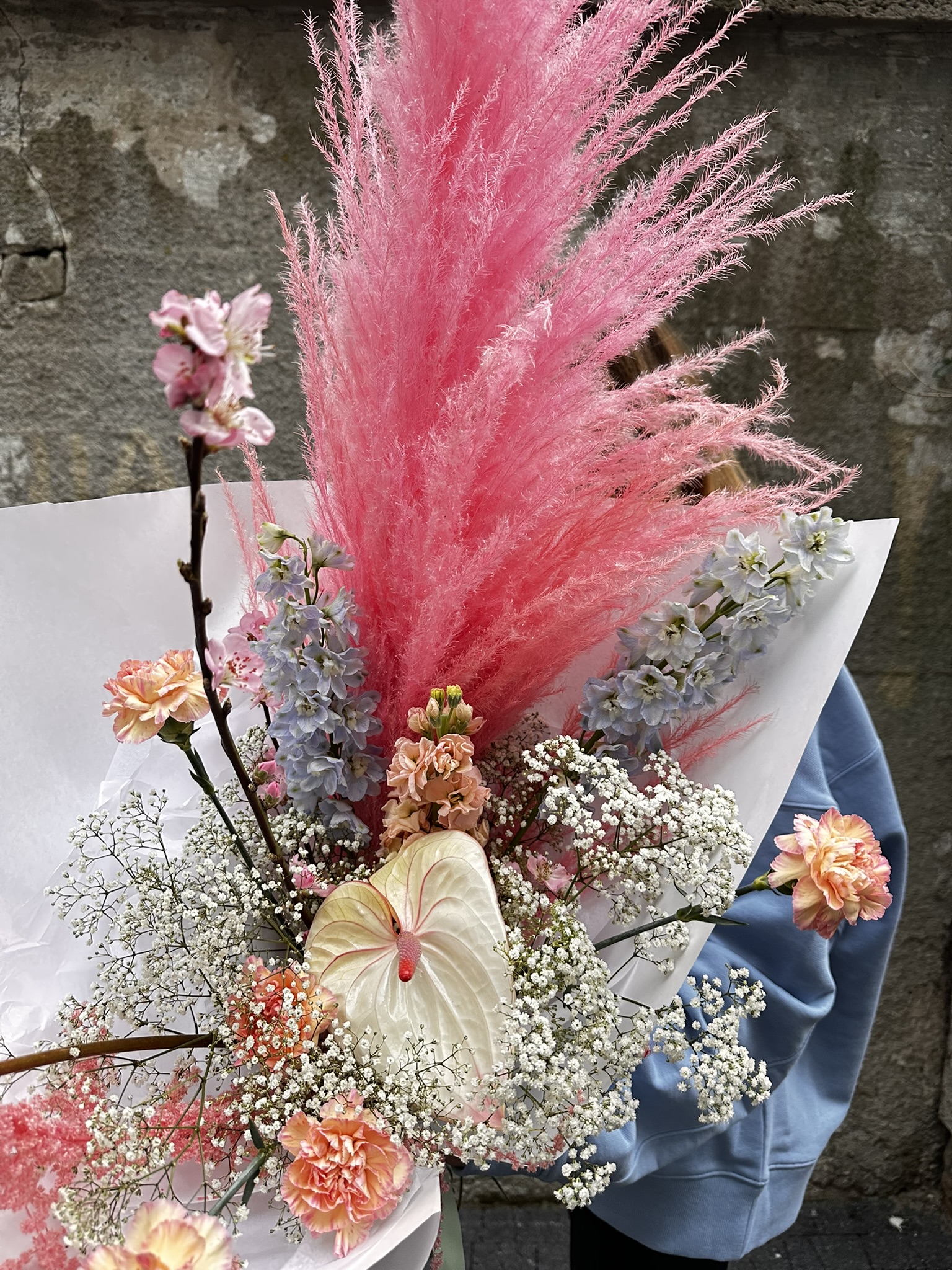 Bukiet pełen słodyczy w którym delikatna gipsówka, goździki i romantyczne ostróżki przełamane są charakternym anturium – to idealne połączenie na Dzień Kobiet.