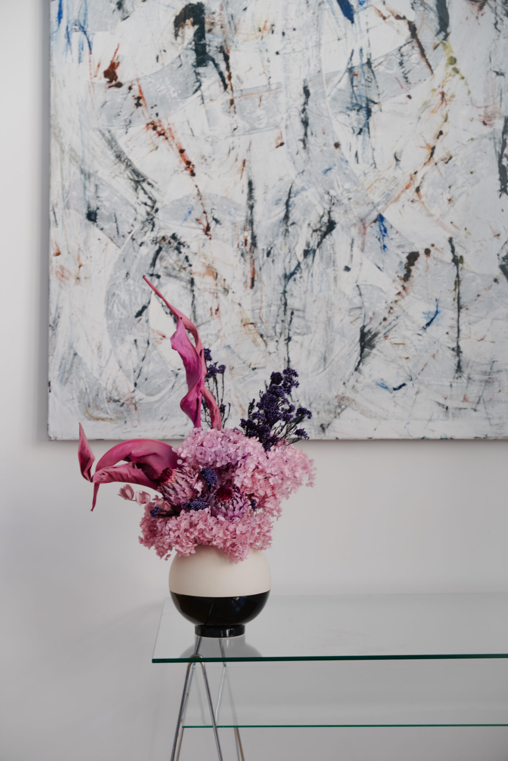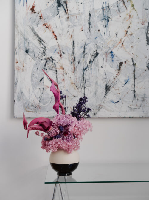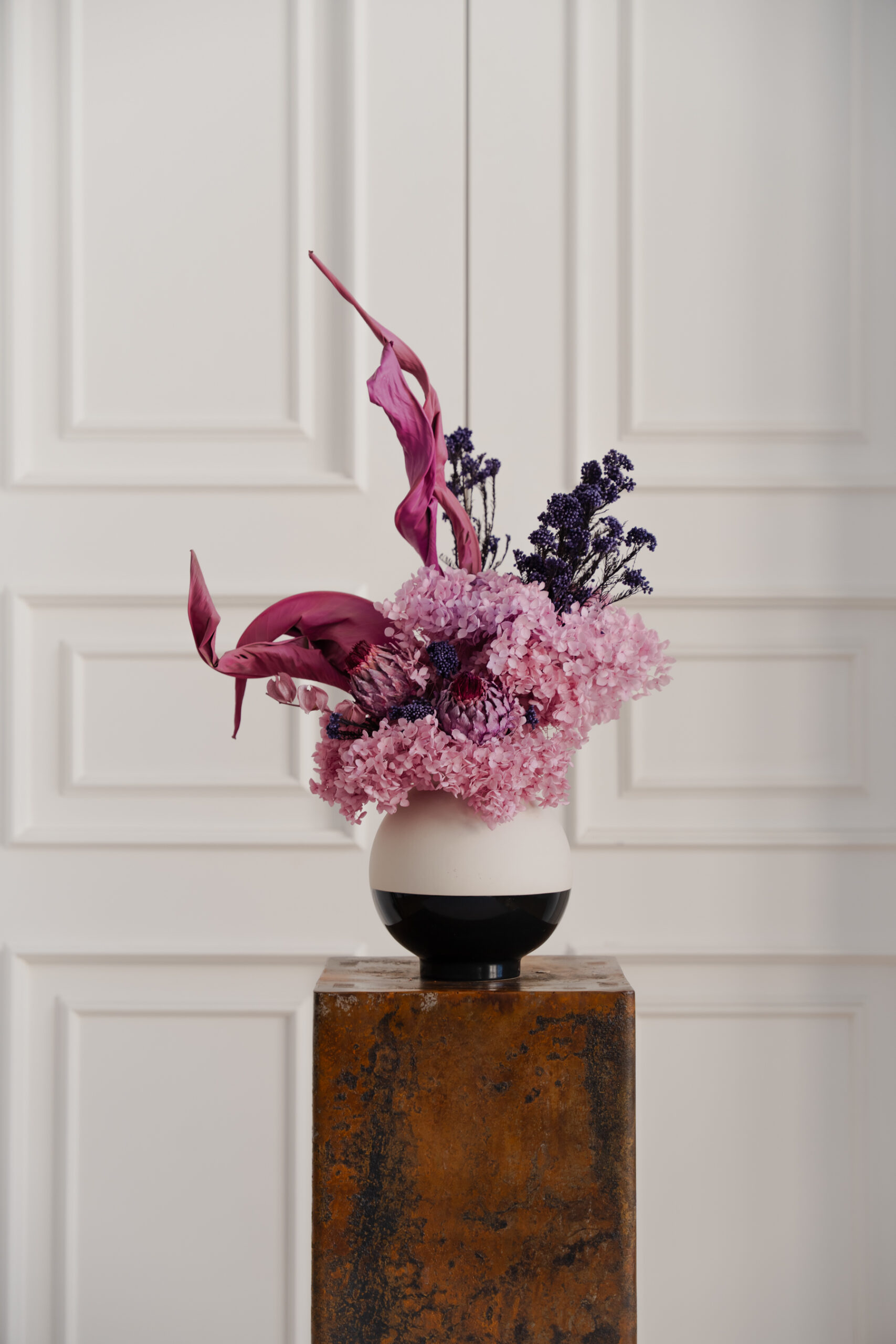 Bukiet w mono kolorystce, bazujący na preparowanej hortensji.