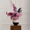 W skład bukietu wchodzą niebieskie hortensje, niebieska trawa pampasowa, fioletowy modrzew, różowy rice flower, różowy amarantus i fioletowe karczochy.
