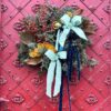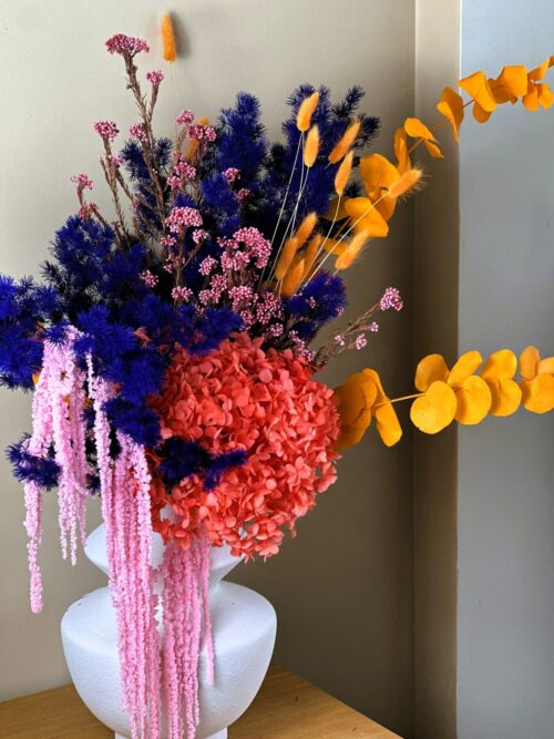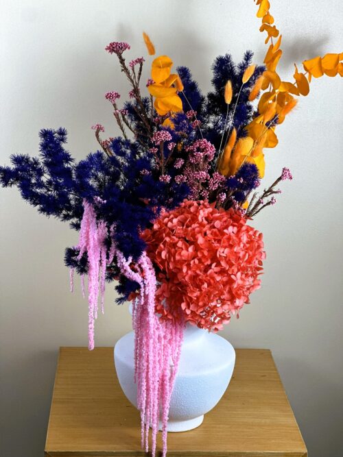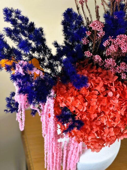 Bukiet w intensywnych kolorach z preparowanego asparagusa, hortensji, eukaliptusa, szarłatu i rice flower.