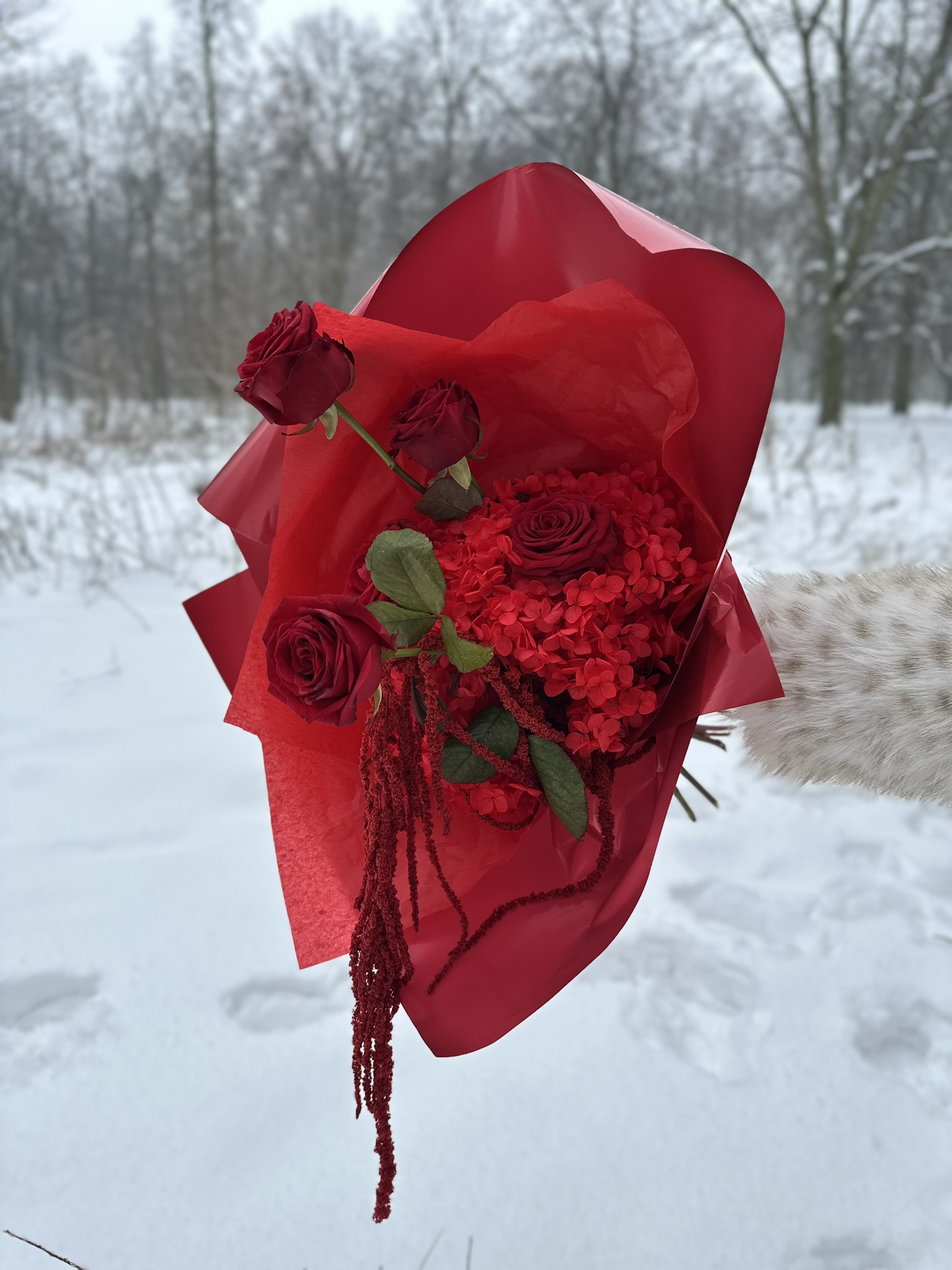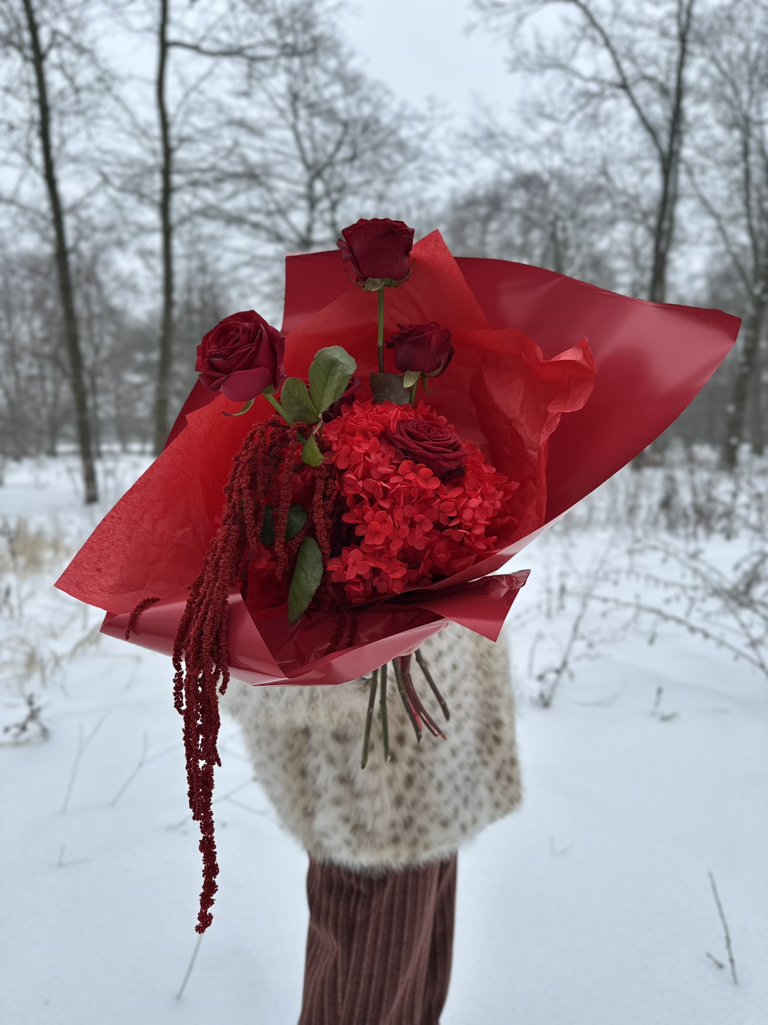 Wyrazisty, czerwony bukiet walentynkowy, który mówi wszystko bez słów. Kompozycja z preparowanej czerwonej hortensji, świeżych czerwonych róż oraz preparowanego szarłatu zachwyca intensywnym kolorem i elegancją. Dzięki elementom preparowanym część z bukietu pozostanie w wazonie na długo.