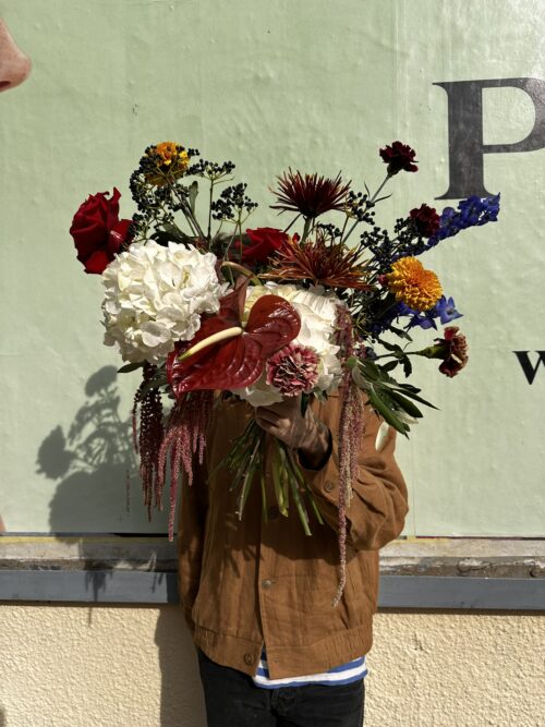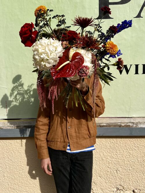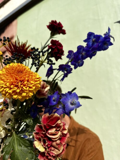 Dodatek brązowej i miodowej chryzantemy, bordo szarłatu oraz granatowej ostróżki* podkreślają jesienny klimat.