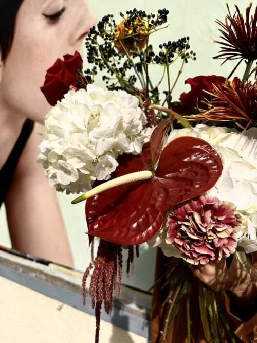 Bukiet jesienny w eleganckim wydaniu z białą hortensją, kontrastującym bordowym anturium i czerwonymi różami.