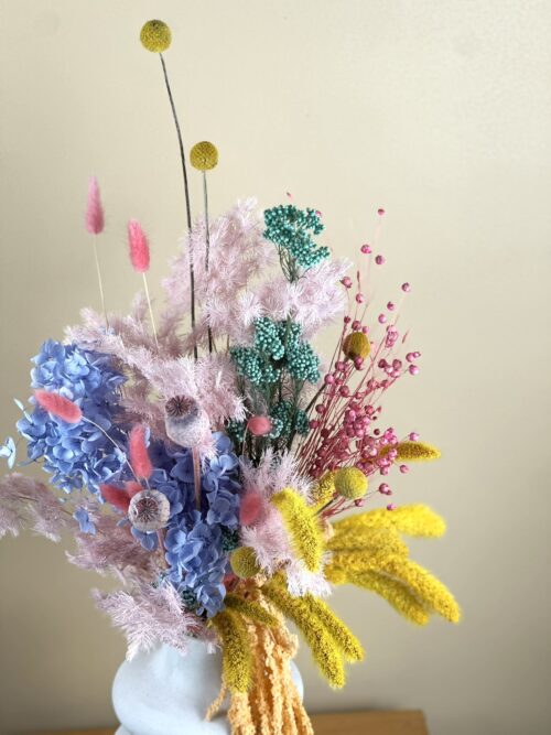 Bukiet w radosnych kolorach z preparowanych i suszonych roślin.