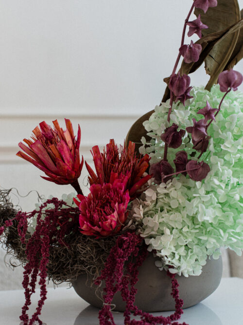 Kompozycja w naczyniu z roślin suchych i preparowanych, całkowicie bezobsługowa – idealna dekoracja na długi czas.