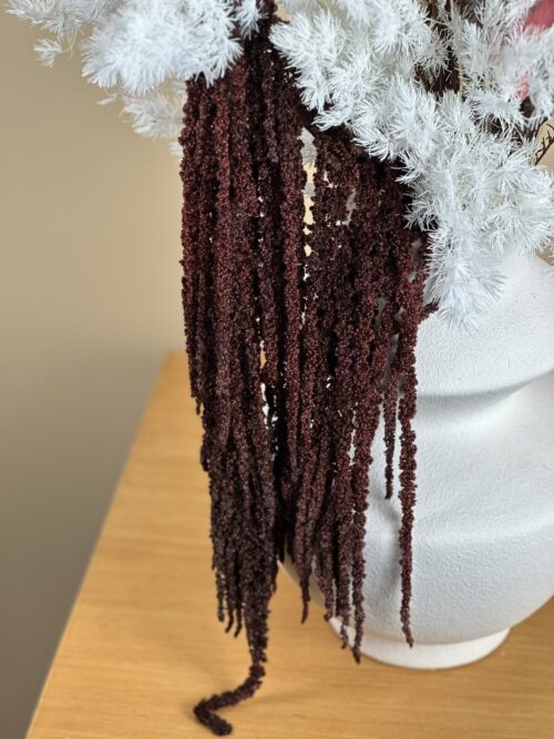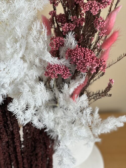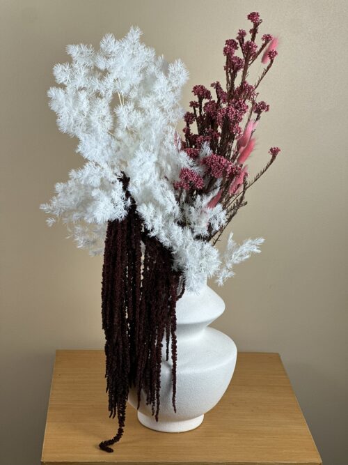 Prosty i efektowny bukiet z preparowanego asparagusa, rice flower i szarłatu.