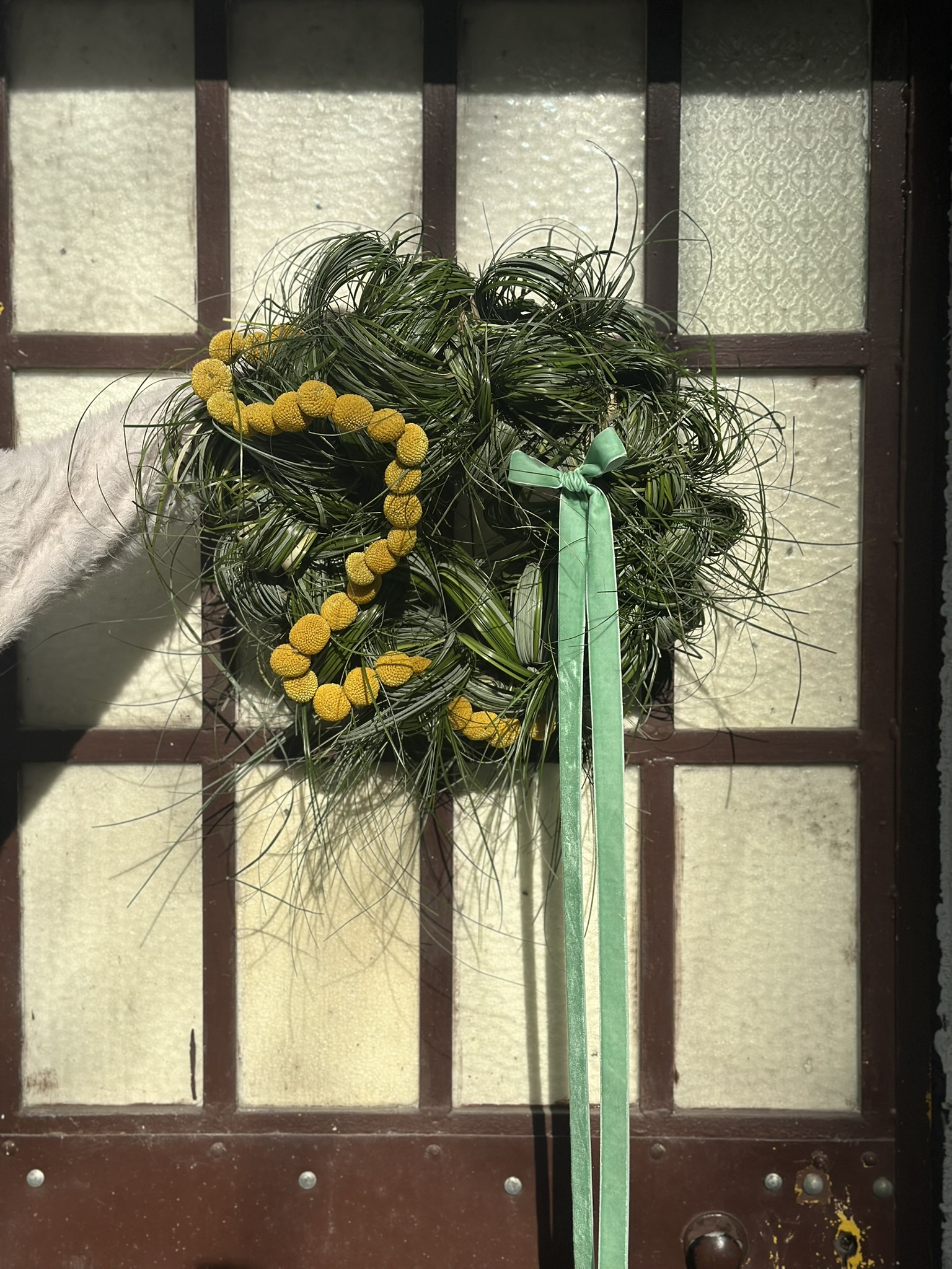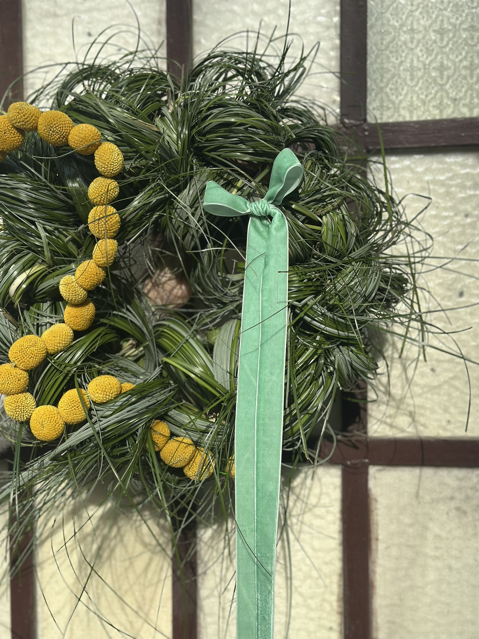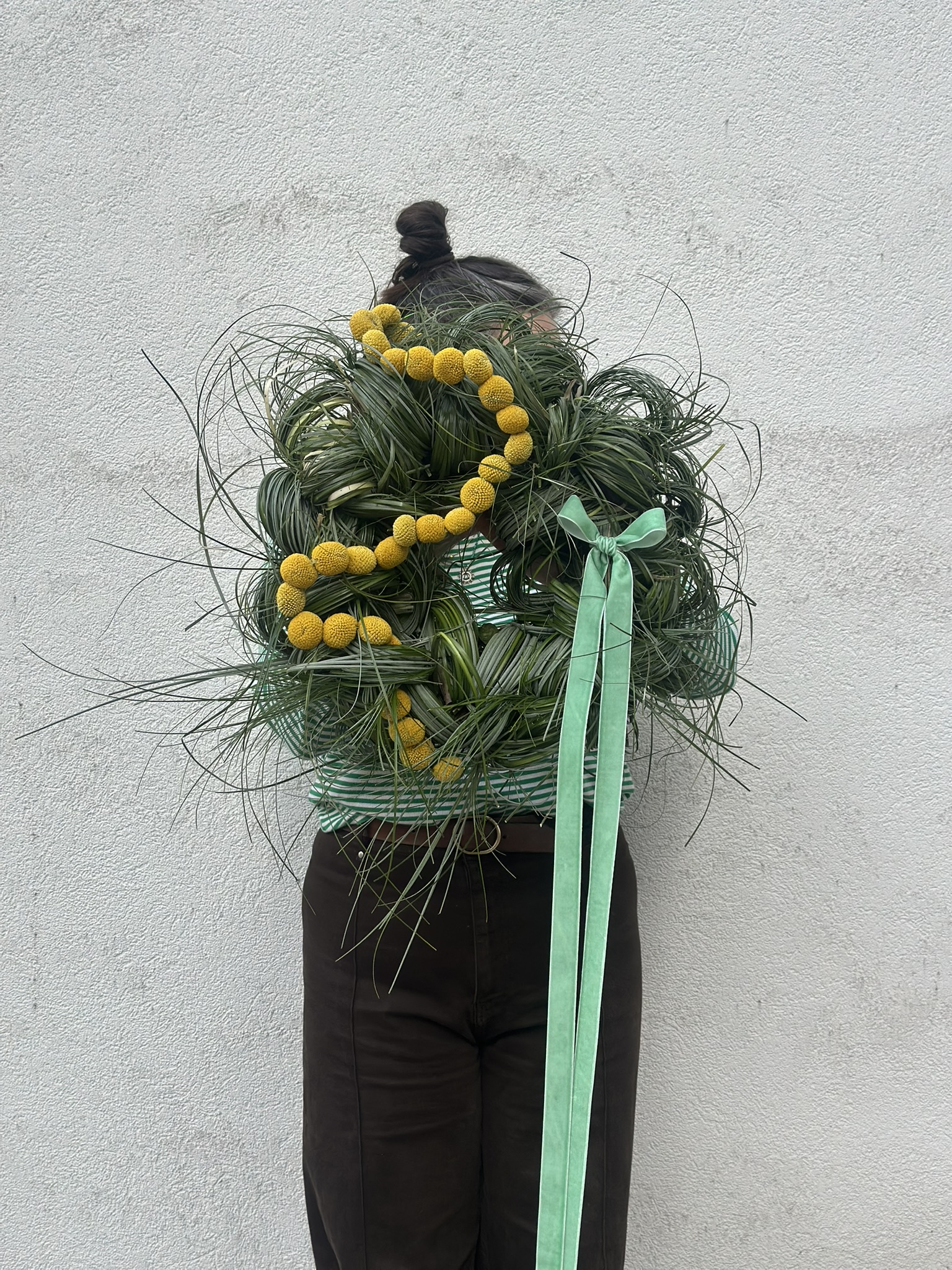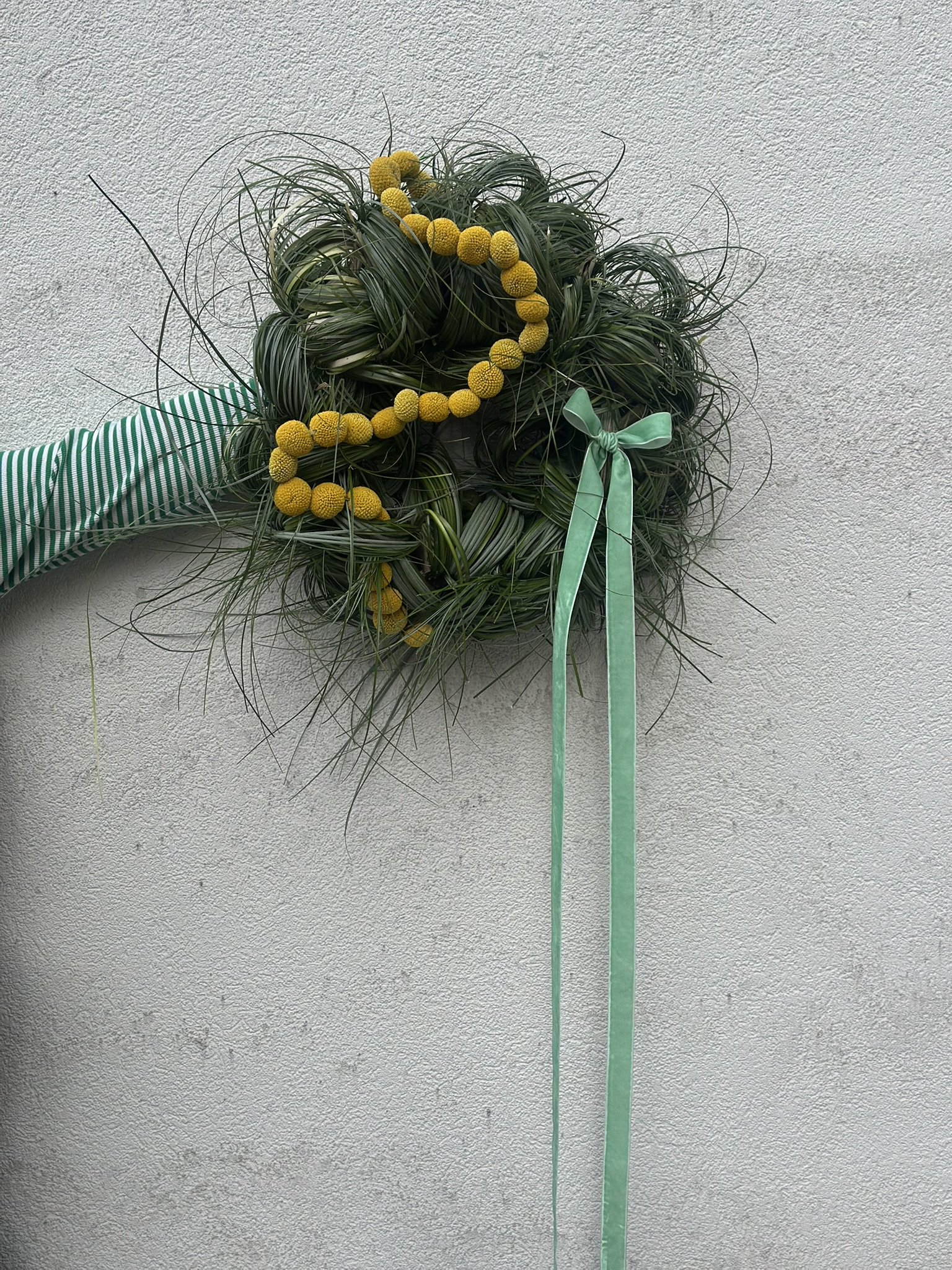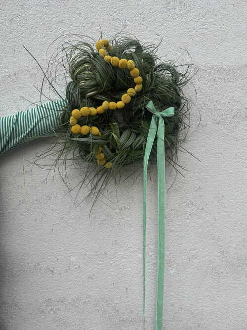 Wianek wielkanocny Kuleczki to świeża, zielona kompozycja z charakterem. Naturalna baza z zielonej trawy została uzupełniona żółtymi kuleczkami kraspedii i długą, aksamitną wstążką, dzięki czemu wianek wygląda nowocześnie, ale dalej bardzo naturalnie. Idealny na drzwi wejściowe albo jako dekoracja wielkanocna do wnętrza.