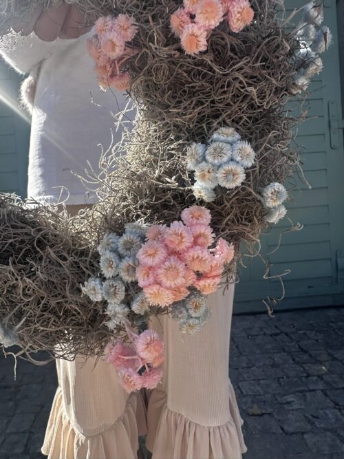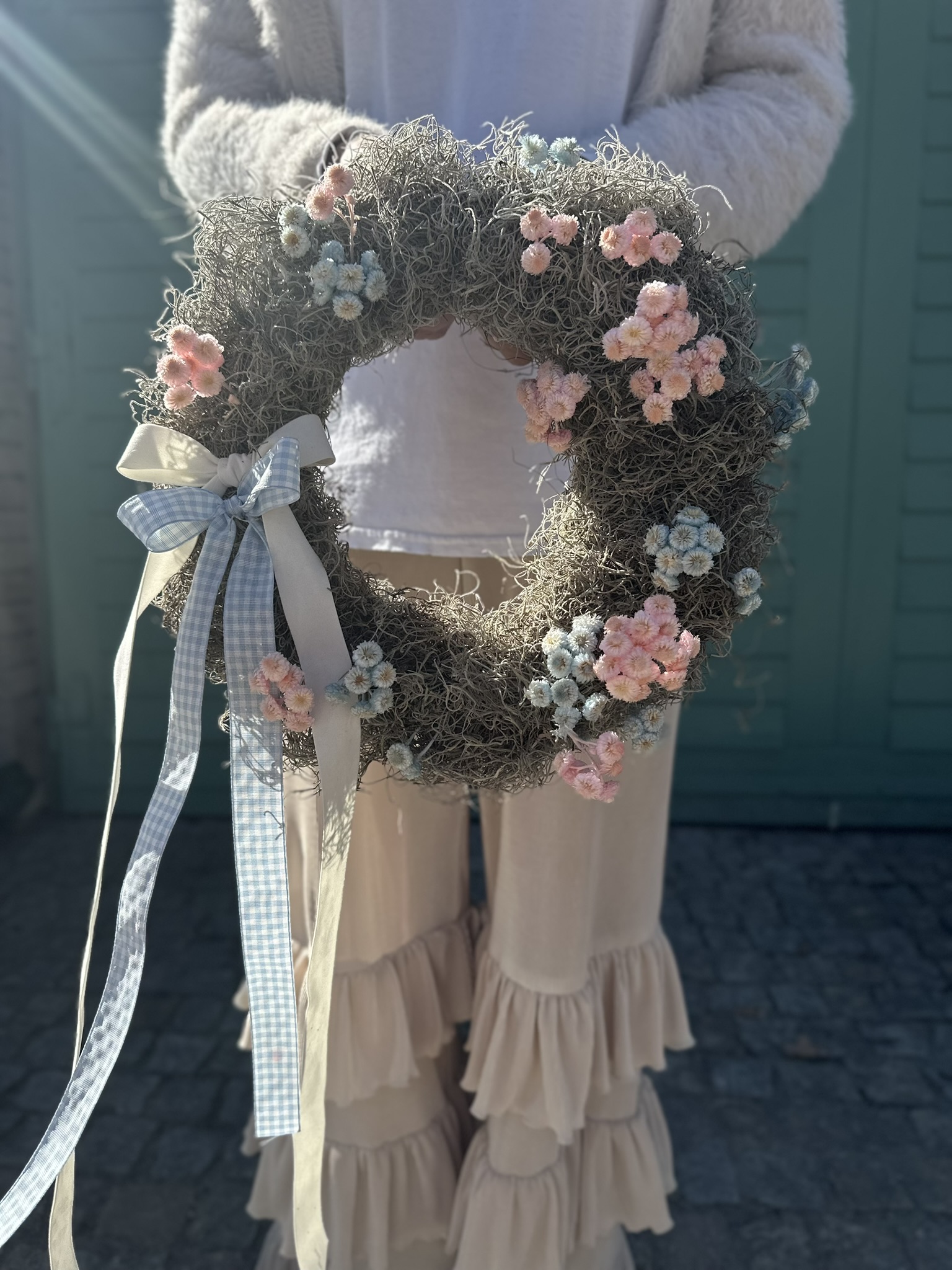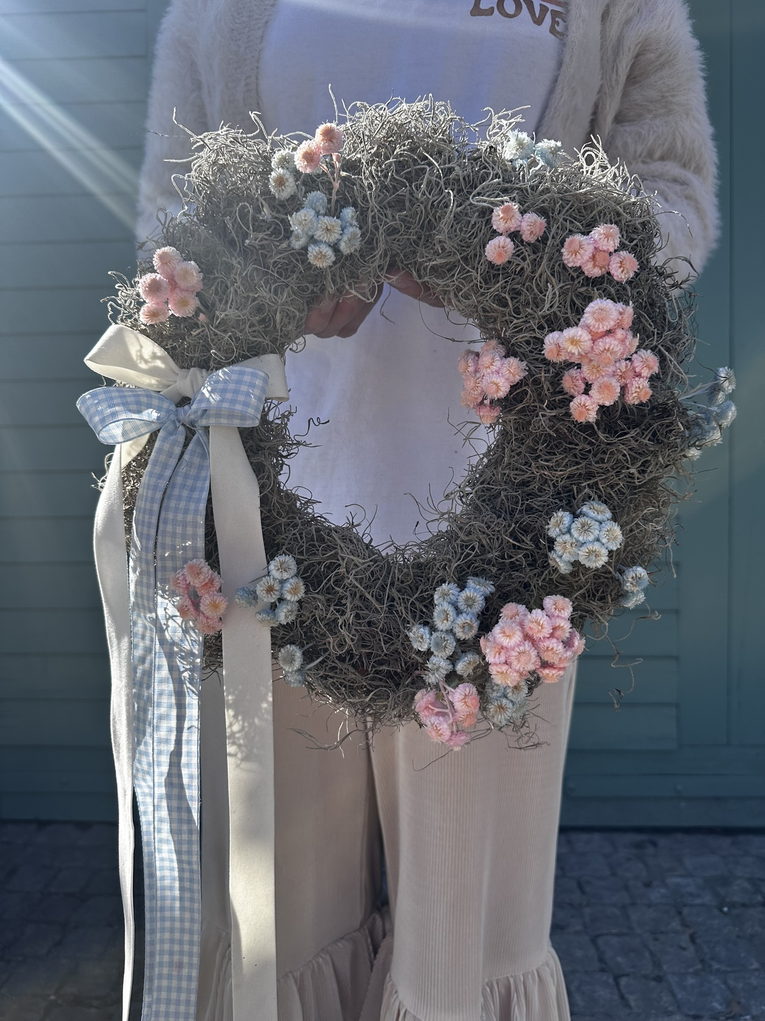 Wiosenny wianek w całości wykonany z suszonej oplątwy z dodatkiem słodkich kwiatuszków glixji w pastelowych barwach.