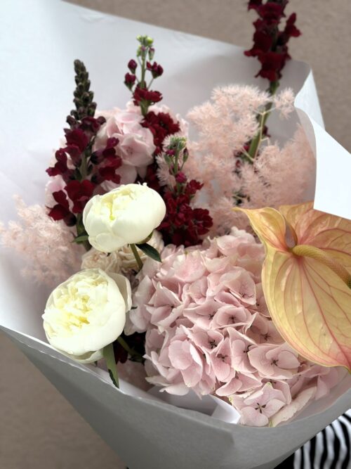 Słodkie różowe hortensje w towarzystwie intensywnych bordo lewkonii i lwiej paszczy – wyjątkowy, jak miłość do Mamy.