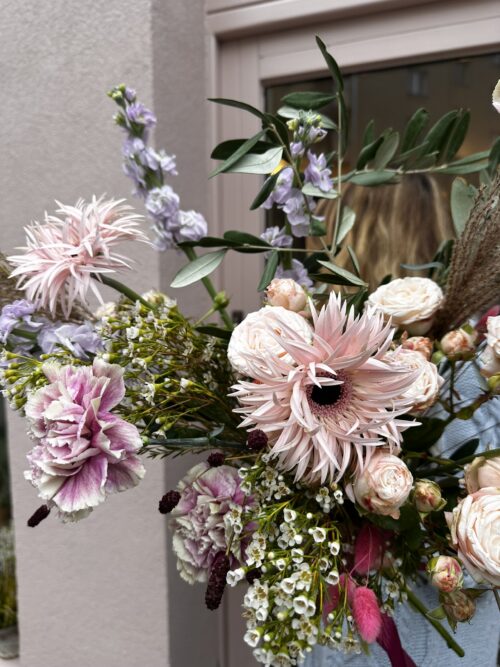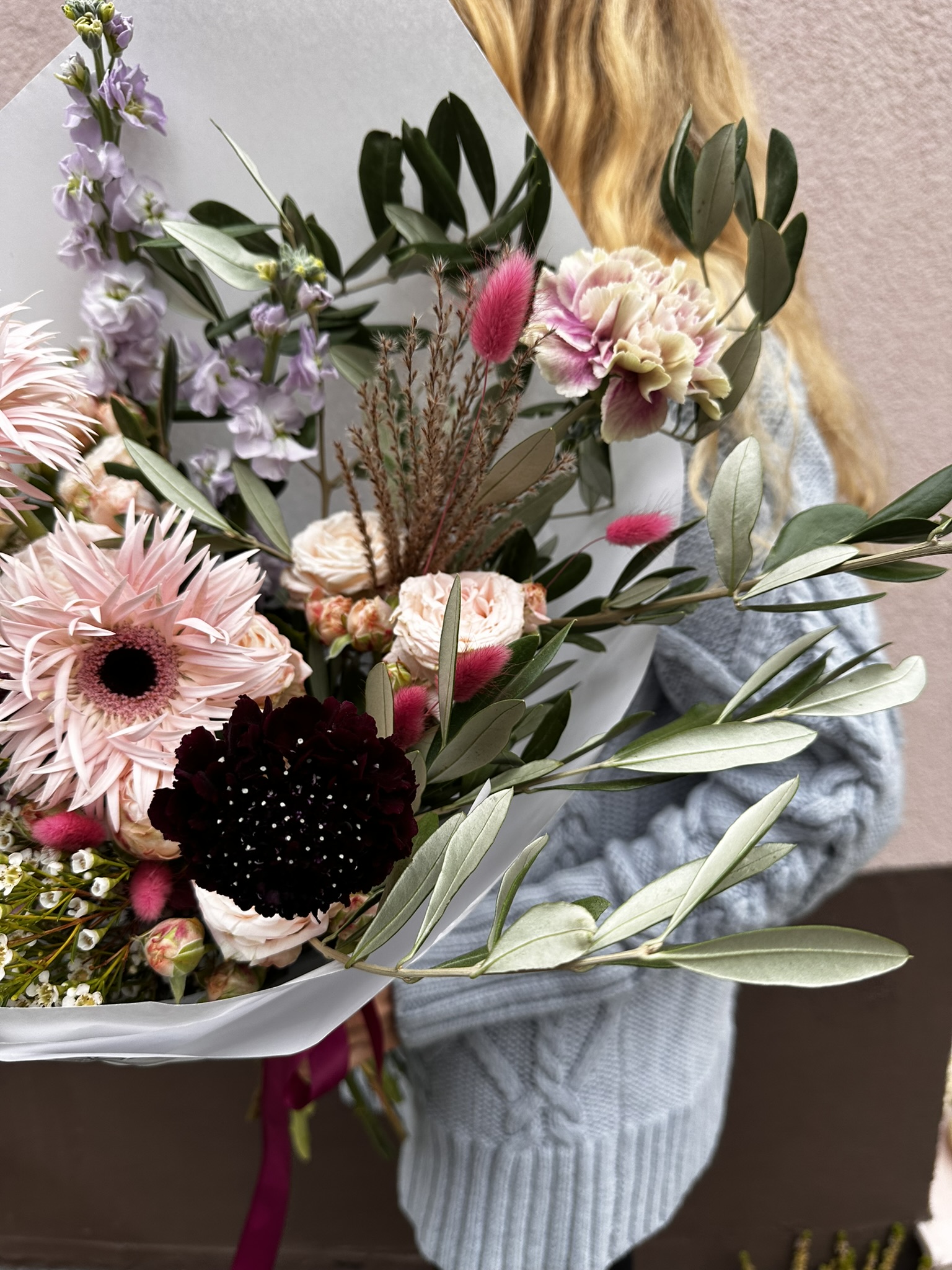 Strzępiaste gerbery, lewkonie, dmuszki i goździki w towarzystwie ciemniejszych dodatków dla przełamania słodyczy 🙂 *