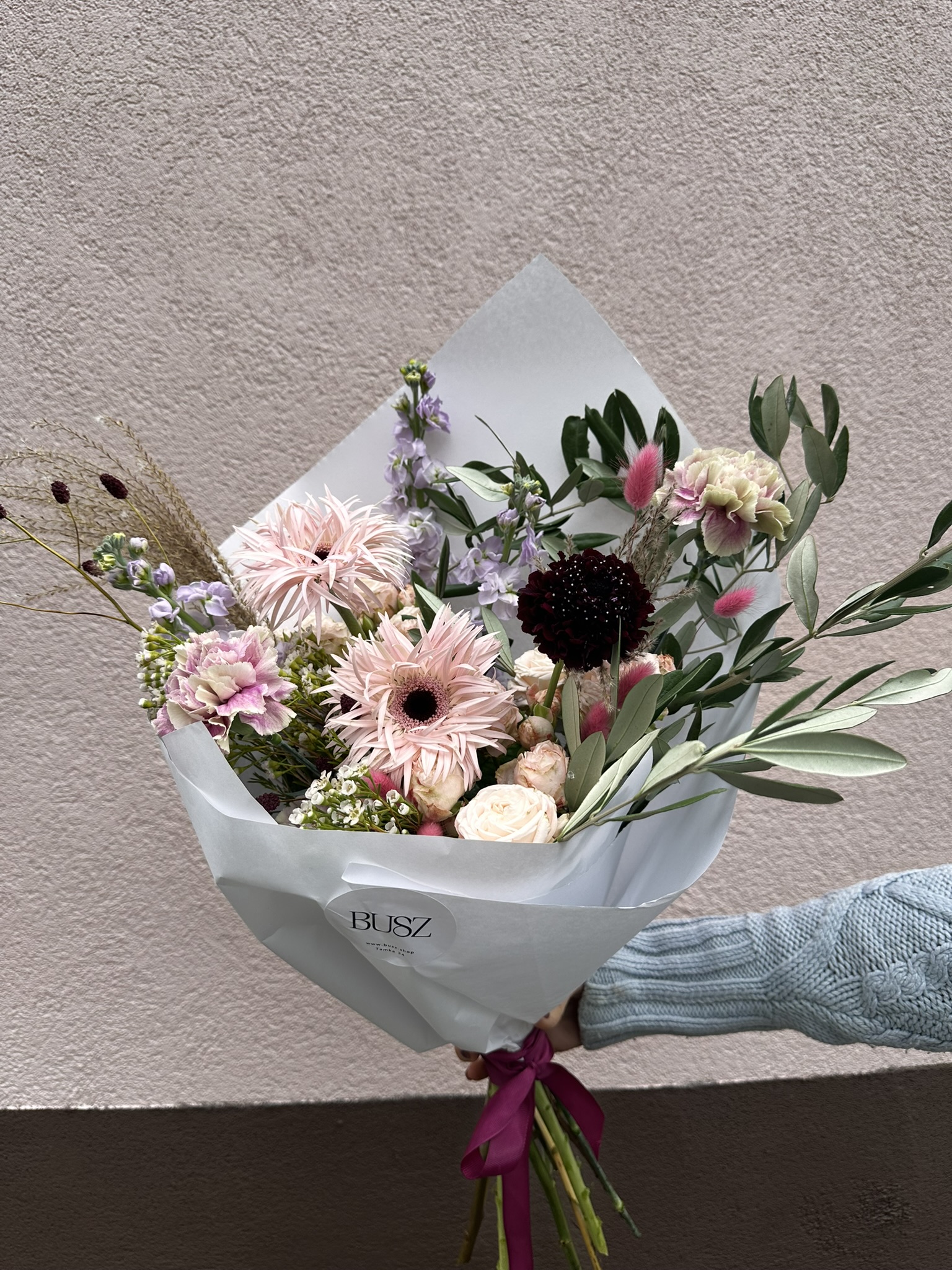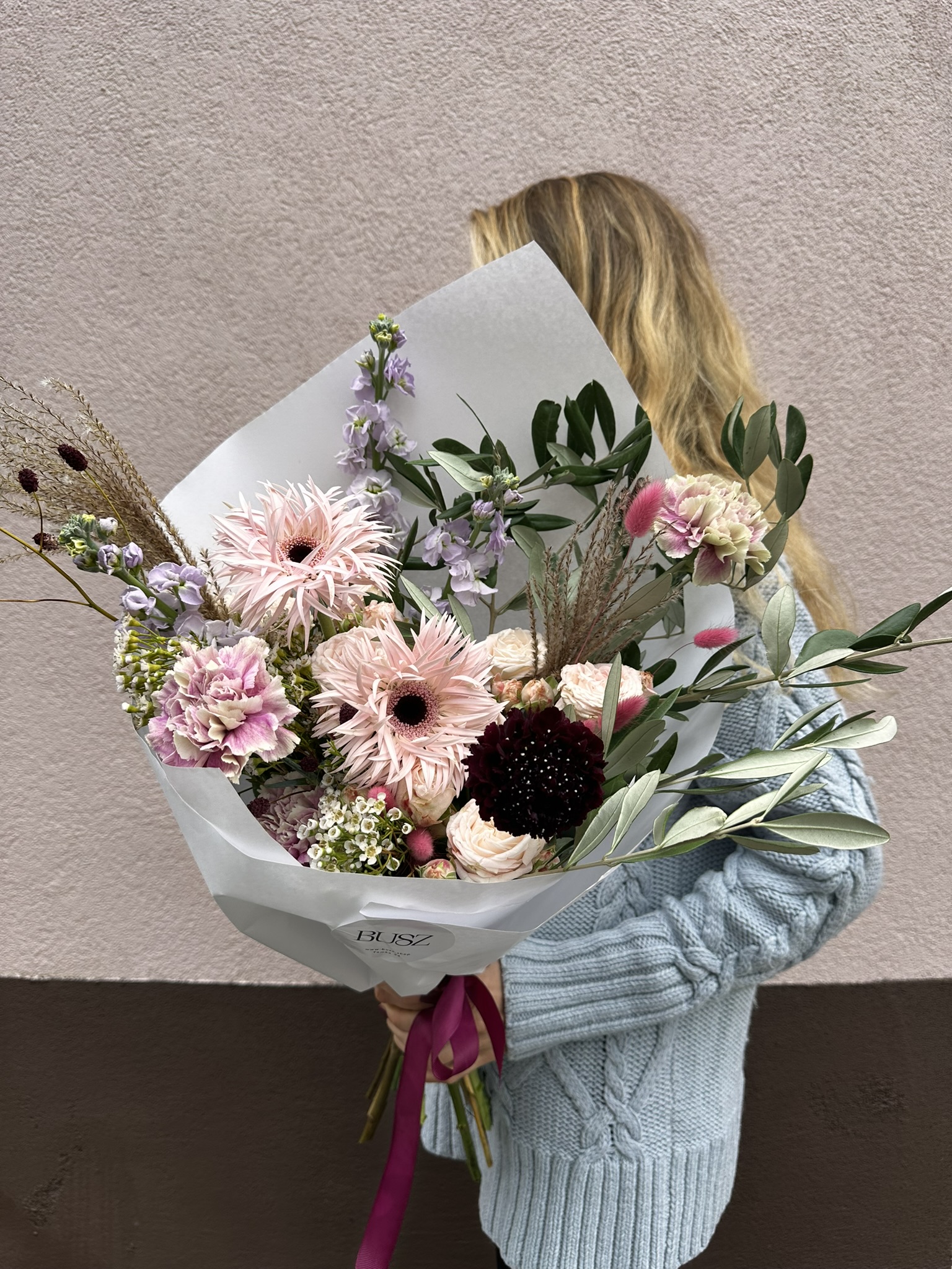 Uroczy, romantyczny bukiet. Słodki, ale nie za słodki dzięki przygaszonym, pastelowym kolorom.