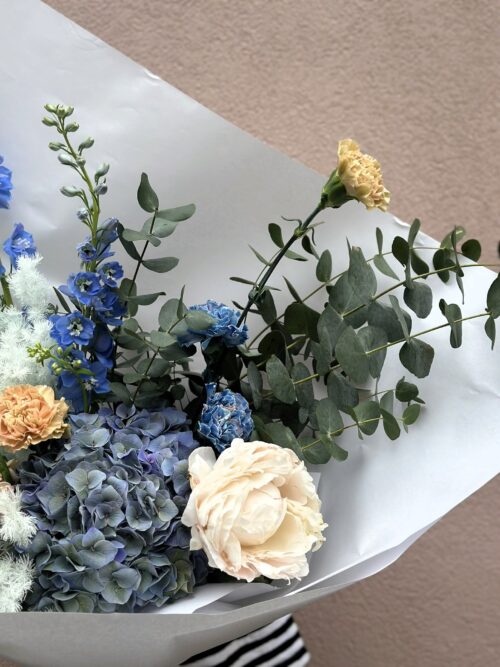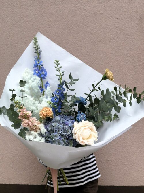 Niebanalny niebieski bukiet, którego podstawą jest hortensja i ostróżka. W kompozycji znajduje się także preparowany modrzew, który może zostać w wazonie na długo po tym jak reszta kwiatów zwiędnie.