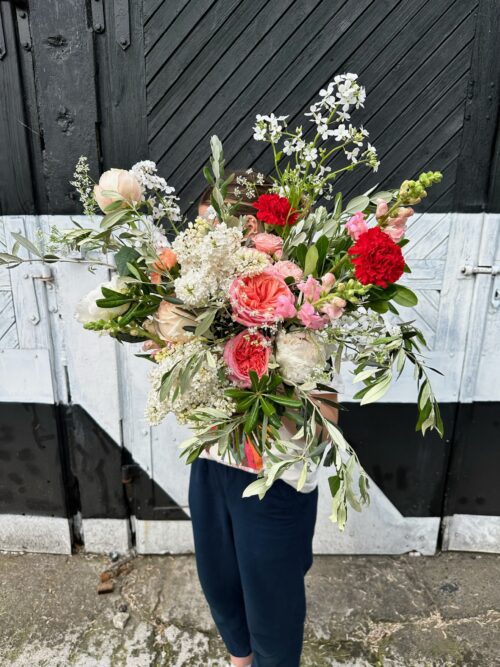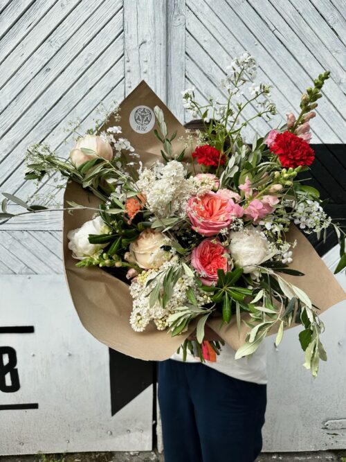 Plan był taki, żeby bukiet przenosił nas do pachnącego ogrodu… i chyba nam się udało 🙂 Pomogły nam w tym róże peoniowe, goździki, oliwka, lwia paszcza, biały bez oraz peonie* Klasyczne, urocze i bardzo kobiece połączenie.