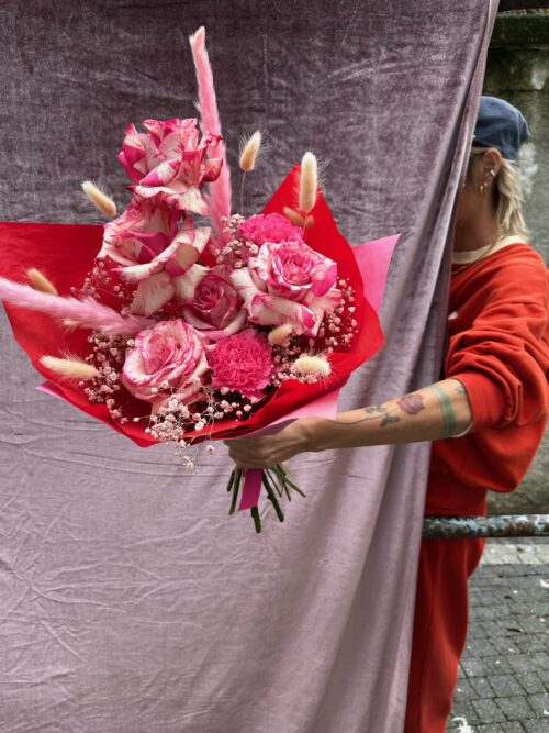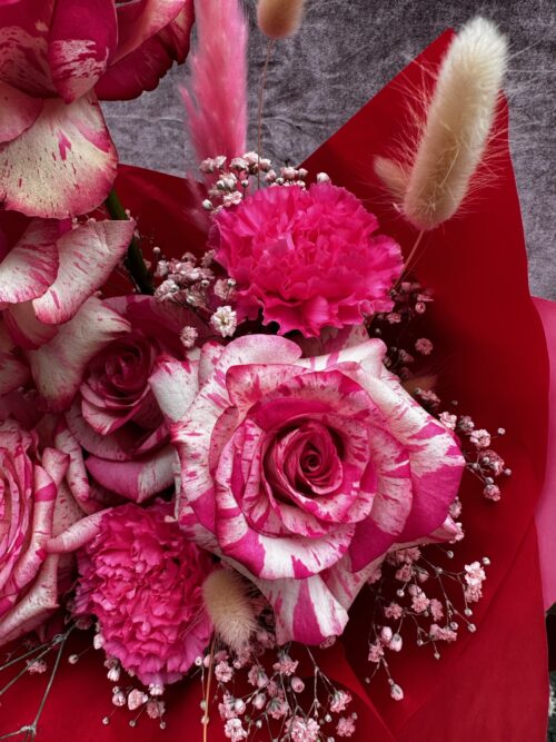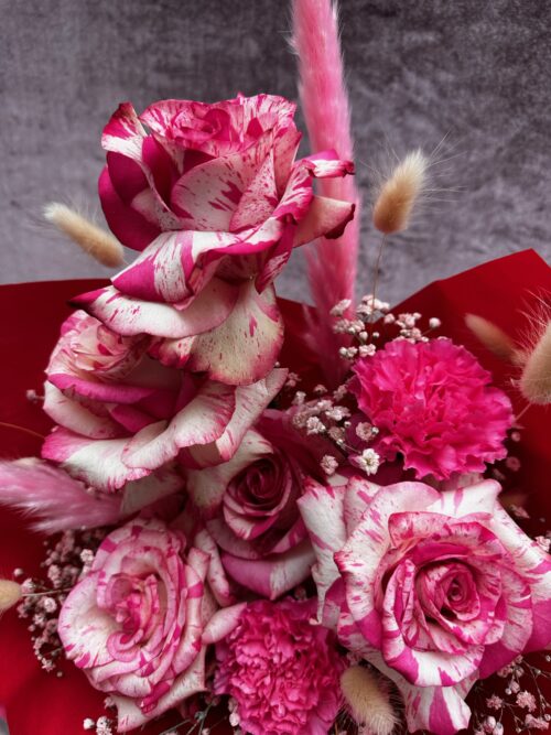 Urocza i słodka paczka róż i goździków z dodatkiem suszonych trawek i pudrowej gipsówki.
