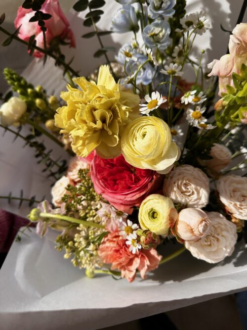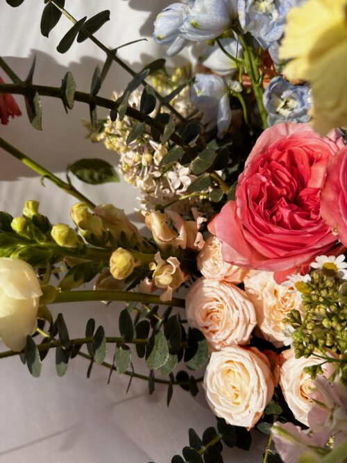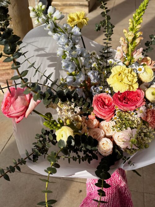Bukiet z rodzaju tych bardzo romantycznych i ogrodowych. Peoniowe róże zachwycają swoim kolorem i obfitością. Towarzyszą jej nie mniej piękne pełniki, goździki, lwie paszcze, bez i smukła ostróżka*. Eukaliptus i rumianek dodają mu jednocześnie szyku i uroku.