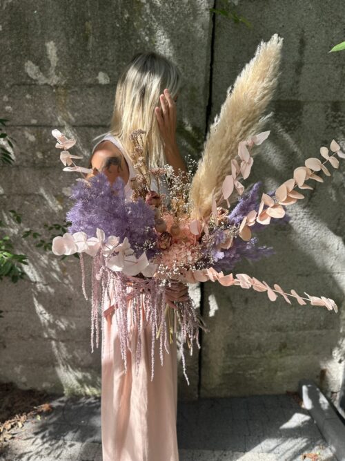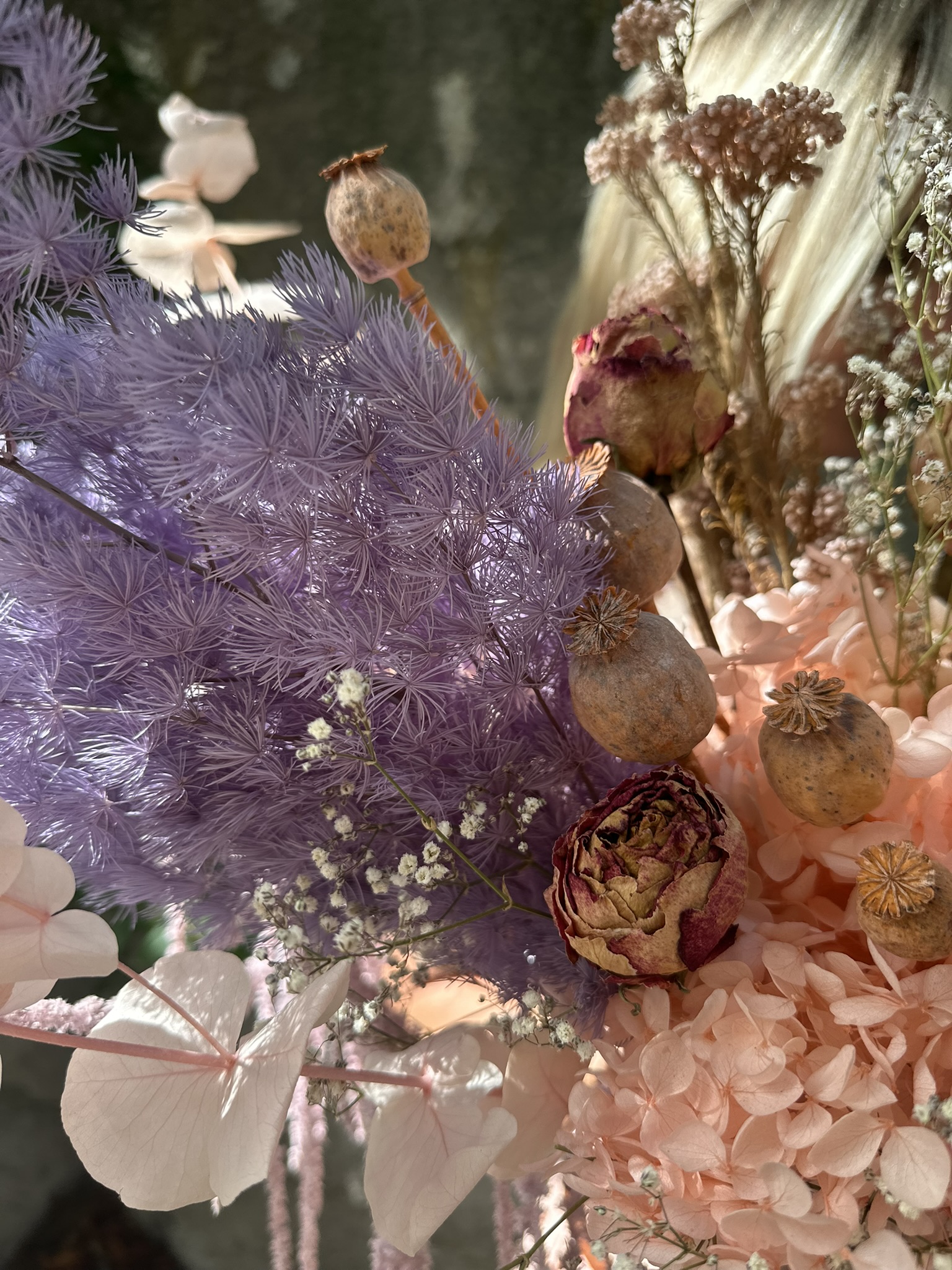 Wyjątkowa kompozycja z suszonych traw, preparowanej hortensji, eukaliptusa i amarantusa w pastelowych odcieniach. Trwały, elegancki i bezobsługowy – idealny do wnętrz w stylu boho i minimalistycznym.