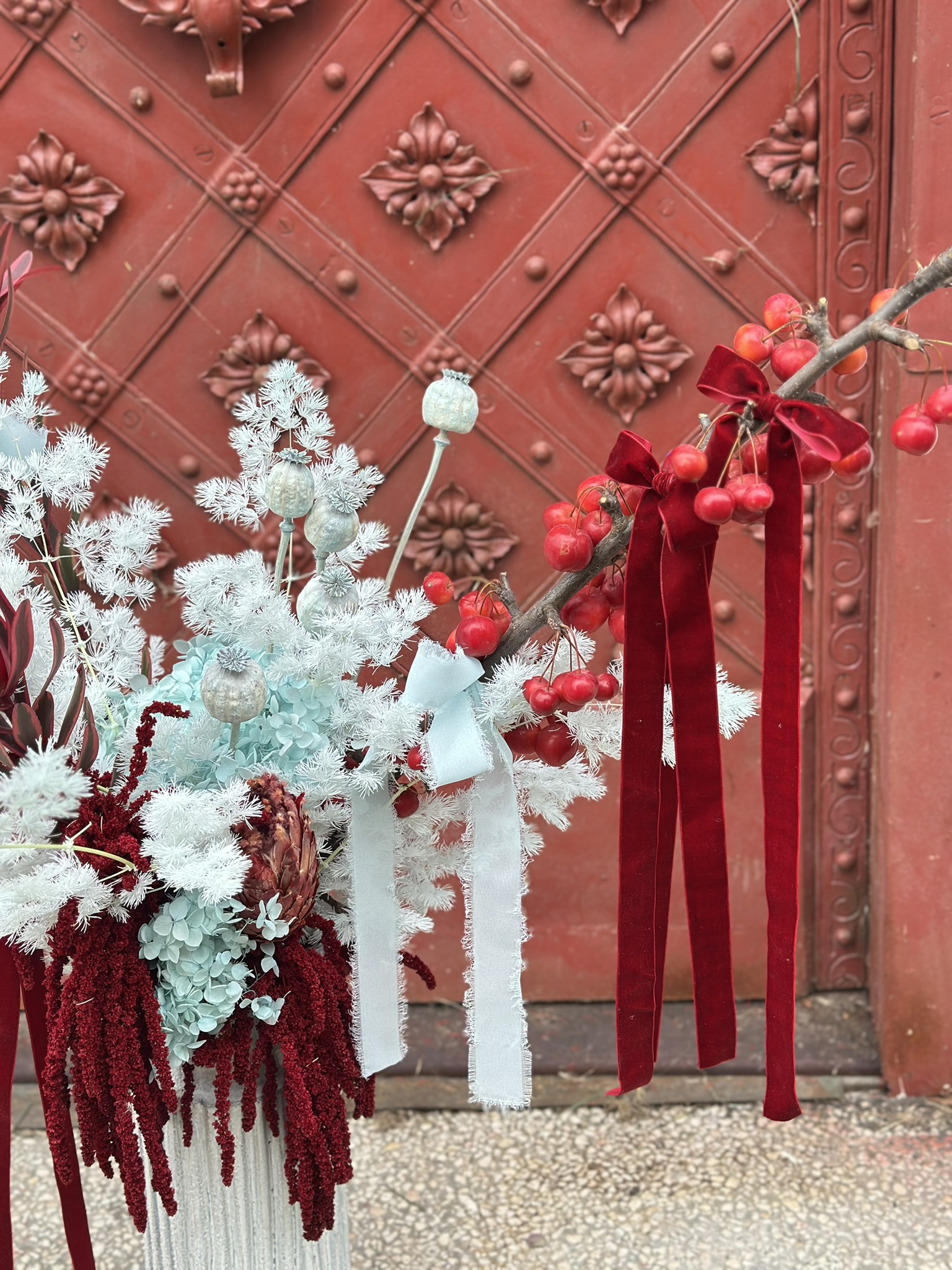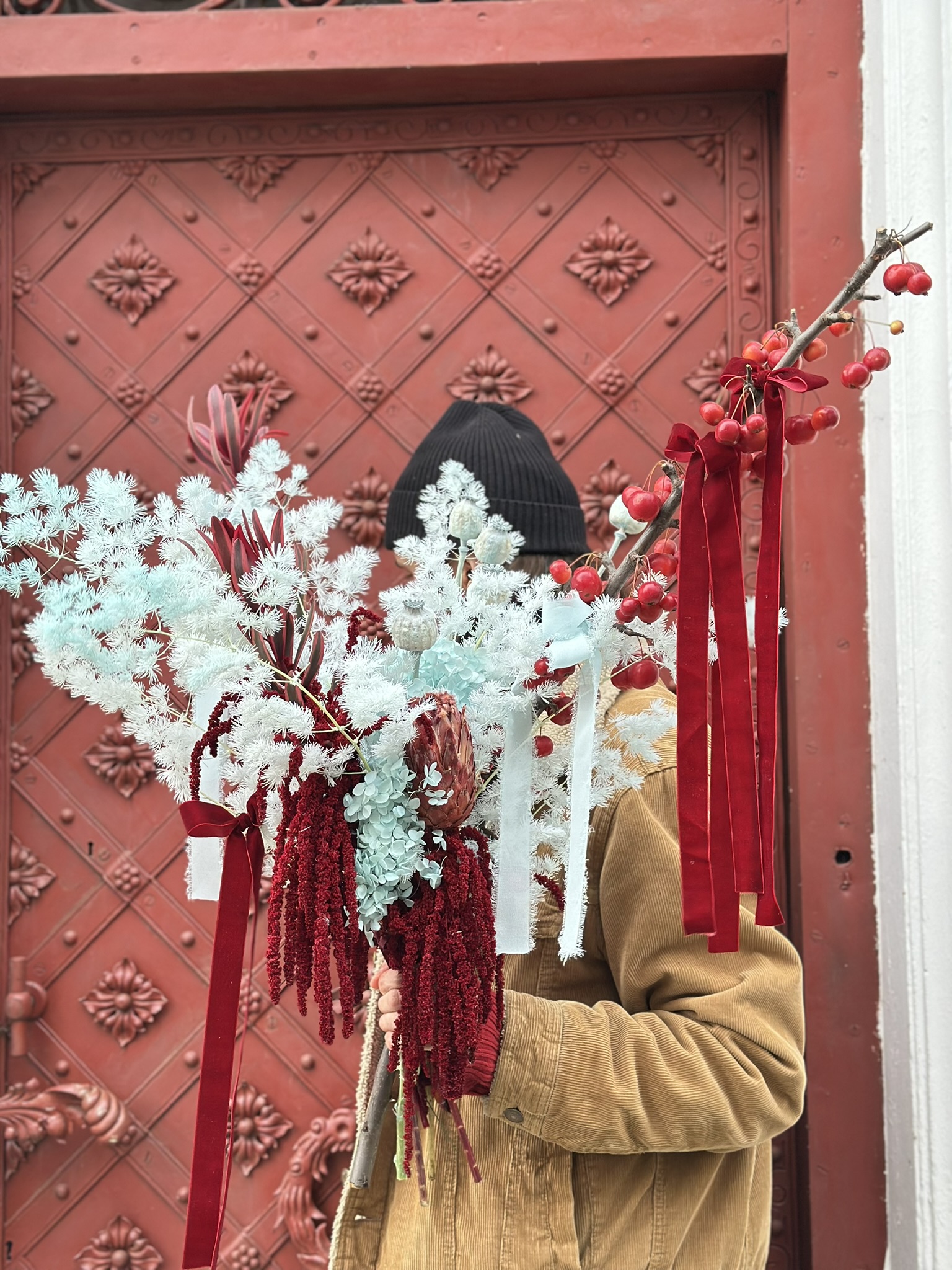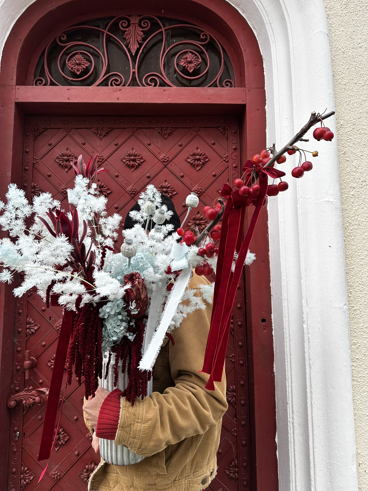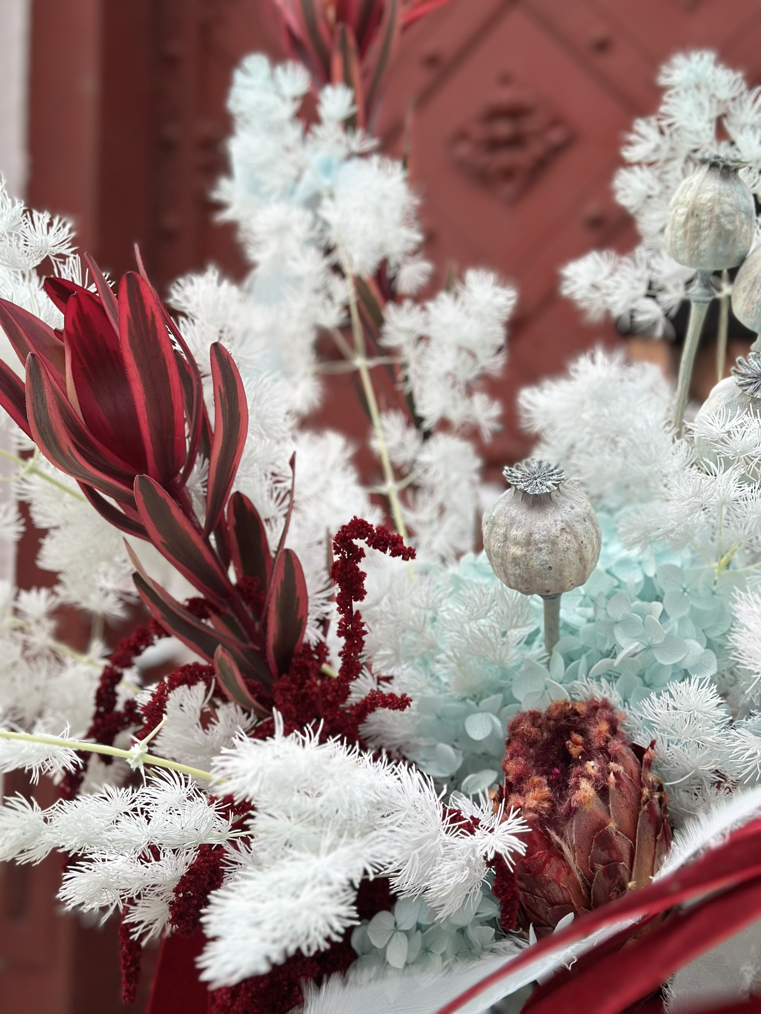 Wybierz Snowberry Mood, jeśli szukasz modnego bukietu, który łączy subtelny błękit z eleganckim bordo — idealny do stworzenia wyjątkowego, świątecznego klimatu w Twoim domu.