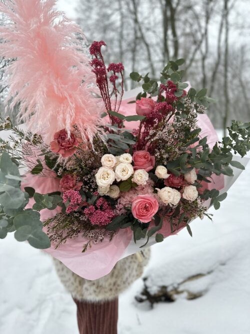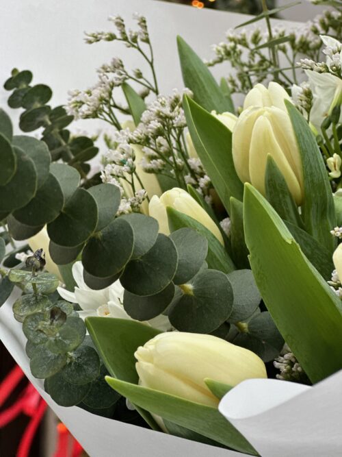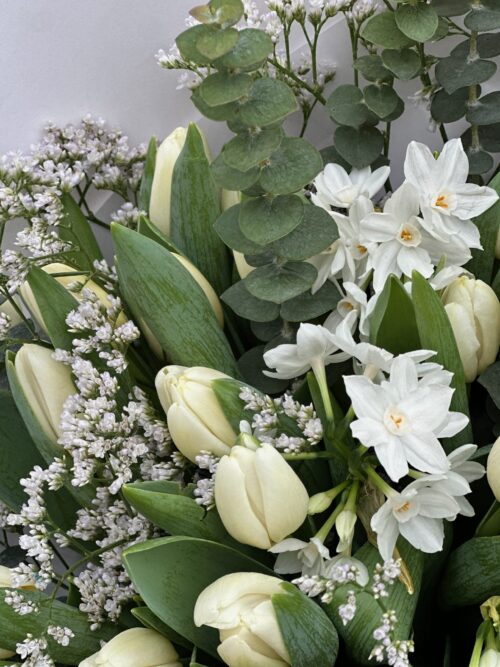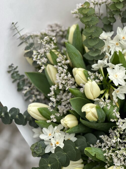 Klasyczny, prosty i delikatny bukiet z białych tulipanów z dodatkiem eukaliptusa, narcyzów i limonium. Biały tulipan ma w sobie to coś, że właściwie kocha go każdy 🙂 Sam w sobie jest wspaniały, a w towarzystwie odpowiednio dobranych roślin nabiera dodatkowego szyku i klasy.