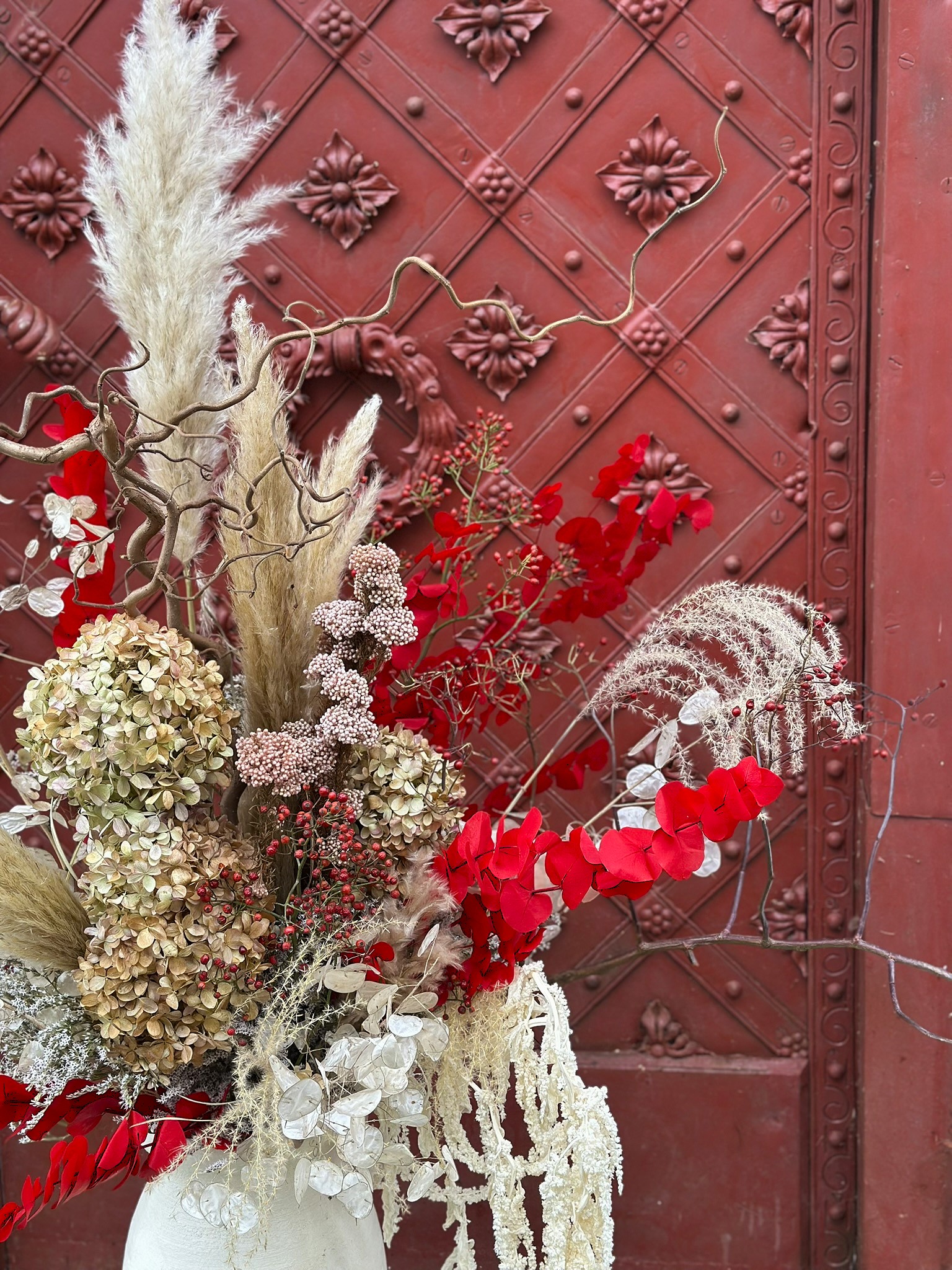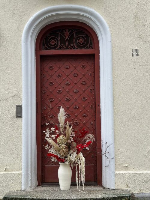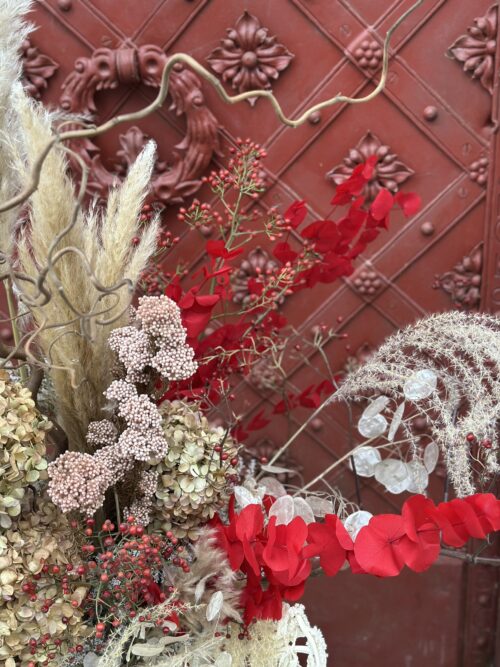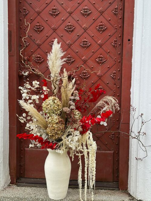 Dominujące odcienie czerwieni, kremu i beżu tworzą efektowny, świąteczny akcent idealny do eleganckich wnętrz. Bukiet „Winter Wild” świetnie sprawdzi się jako dekoracja salonu, ozdoba biura, element wystroju restauracji czy hotelowego lobby. Postawiony w wysokim wazonie staje się głównym punktem przestrzeni, przyciągając uwagę naturalnymi teksturami i wyjątkową kompozycją.